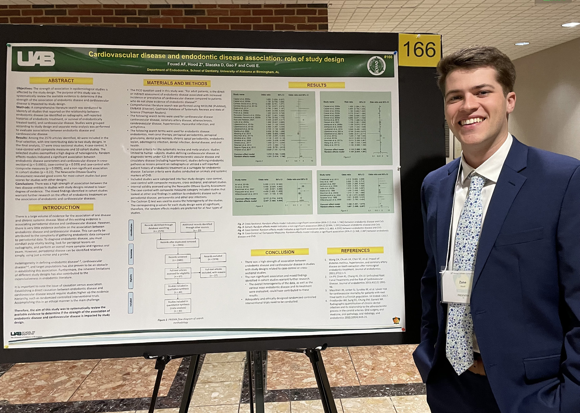 After meeting with him and sharing my interests, he gave me an opportunity to help him complete an ongoing systematic review and meta-analysis. After several months of work, I was able to put an abstract together and complete the review. In March 2023, I flew to Portland, OR where I gave an interactive talk presentation at the 2023 AADOCR/IADR conference on my research: “Cardiovascular disease and endodontic disease association: Role of study design”. That same month I participated in the UAB Scholar’s Symposium via poster presentation, where I was fortunate enough to win 3rd place in the Scholarly Activity section and was selected to present my research at the Hinman Student Research Symposium at the Peabody Hotel in Memphis, TN.