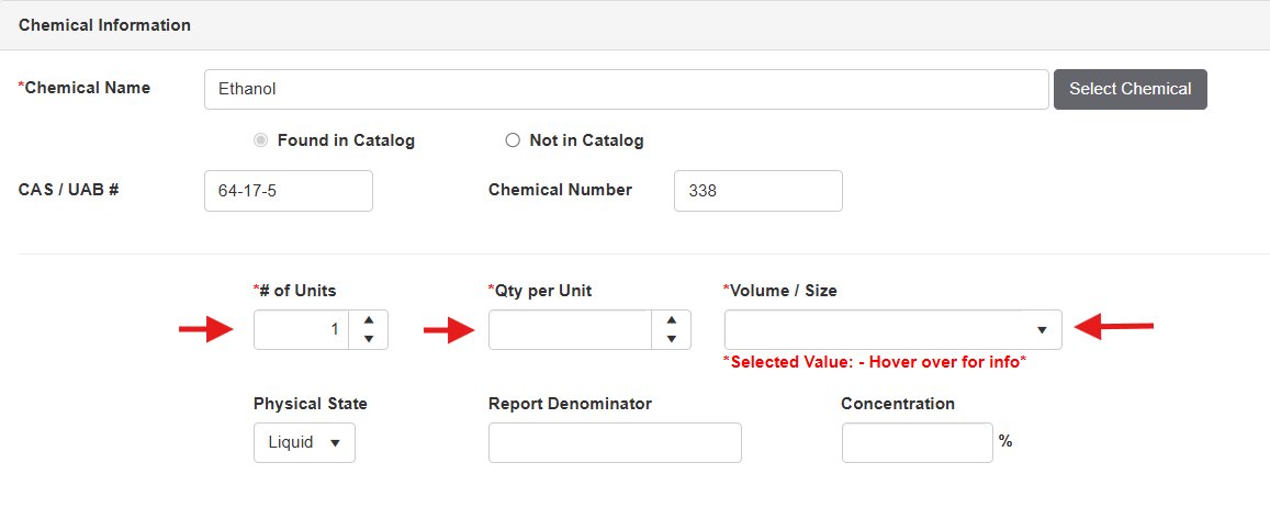 5. After selecting the chemical from the system’s catalog, a new screen will pop up - you must fill out all the information highlighted with a red asterisk.