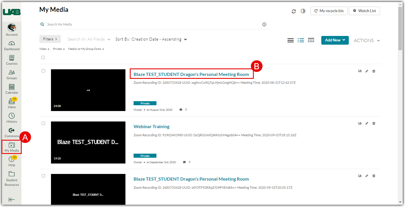 - Go to My Media (A) in the global navigation menu. From here, click on the desired Video Title (B).