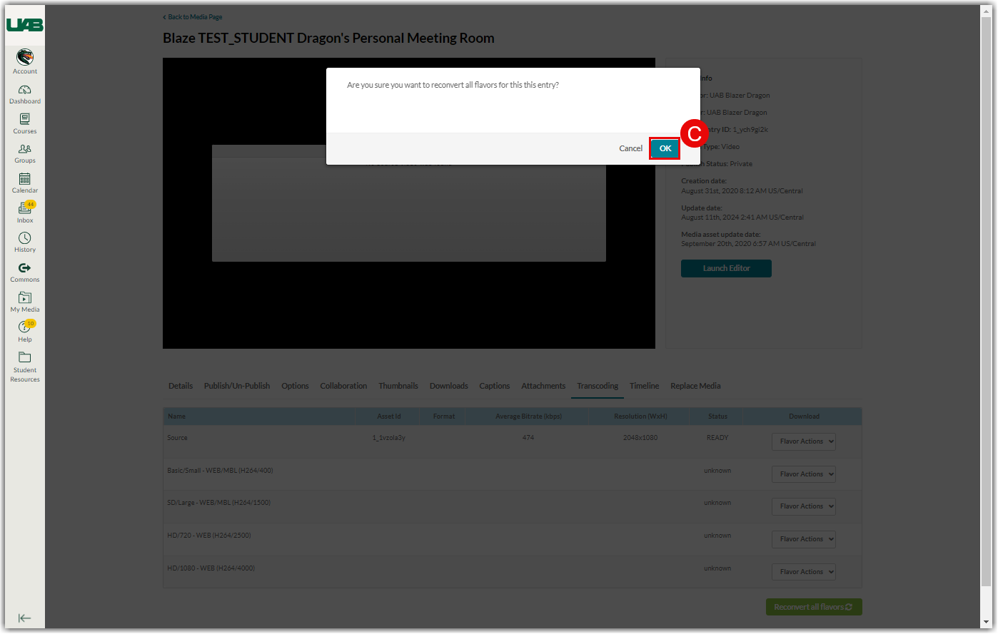 - Scroll down to the editing options tabs and select Transcoding (A). Click Reconvert all flavors (B). Click OK (C) in the pop-up window to begin the reconversion.