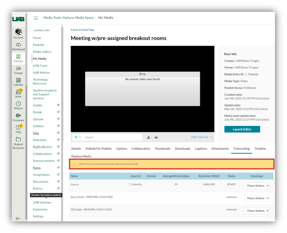 Media that sits unplayed for two years in Kaltura will be marked for ‘flavor’ removal. Kaltura flavors represent the required renditions of the source file with distinct codecs, frame sizes and bitrates. If your flavors have been removed, and you would like them reinstated, follow the steps below.