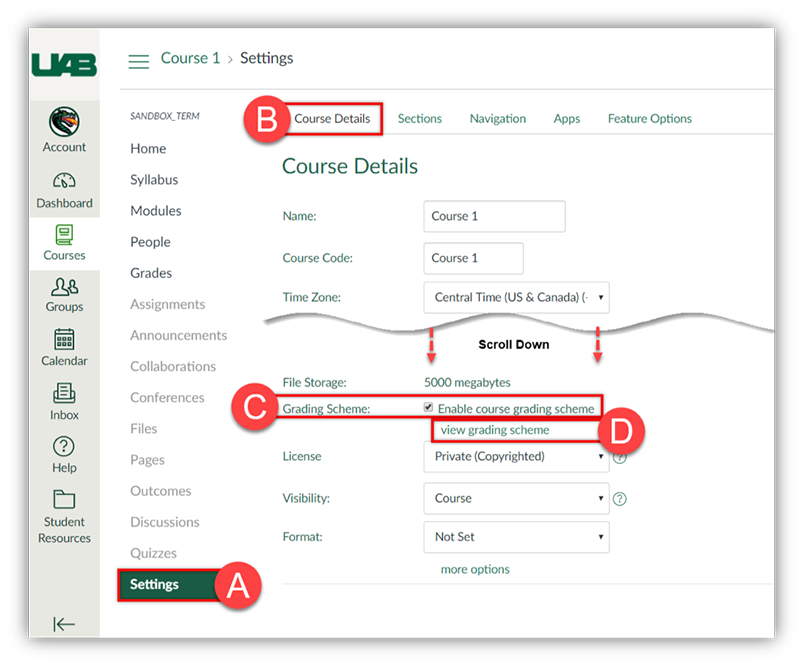 - Scroll down and check the box beside Enable course grading scheme (C).