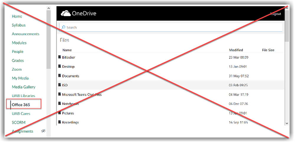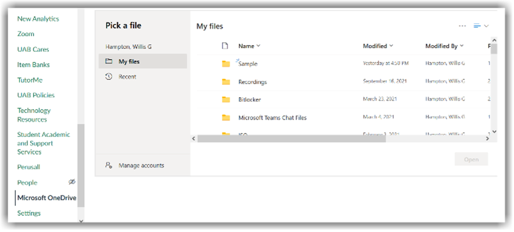 - Re-Authenticate. To access the OneDrive Integration in Canvas, click the OneDrive link in Course Navigation. You will be asked to sign in. There will be a popup window to enter your UAB email address [blazerid @ uab.edu] that will then request your BlazerID and Password.