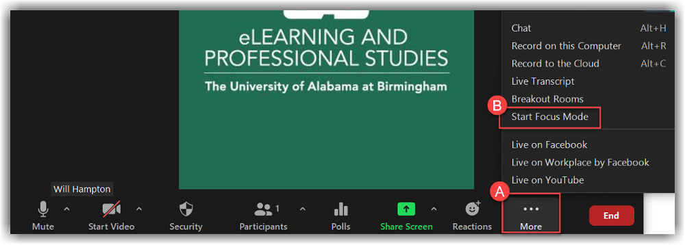 To start focus mode while in a meeting, select More (A), then Start Focus Mode (B). Remember that when a Host or Co-Host enables Focus Mode, Participants cannot turn it off themselves. Participants can turn on Focus Mode for themselves only when Focus Mode is not turned on by the Host or Co-Host, though this will only affect what that individual Participant sees.