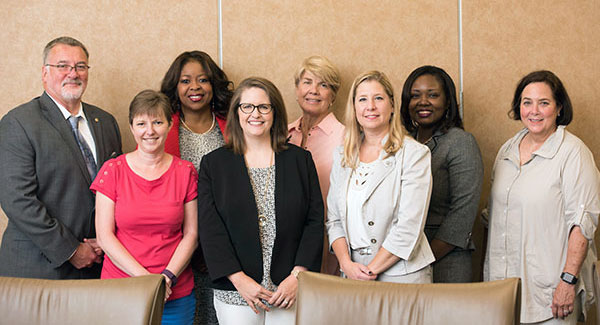 SOE Dean Iwan Alexander with some of the founding members of the Imogene Baswell Society. They are, from left, Shelia Montgomery-Mills, Viola Acoff, Maggie Weems, Mindy Lalor, Kristie Barton, LaQuisha Buggs, and Jeanne Otts.