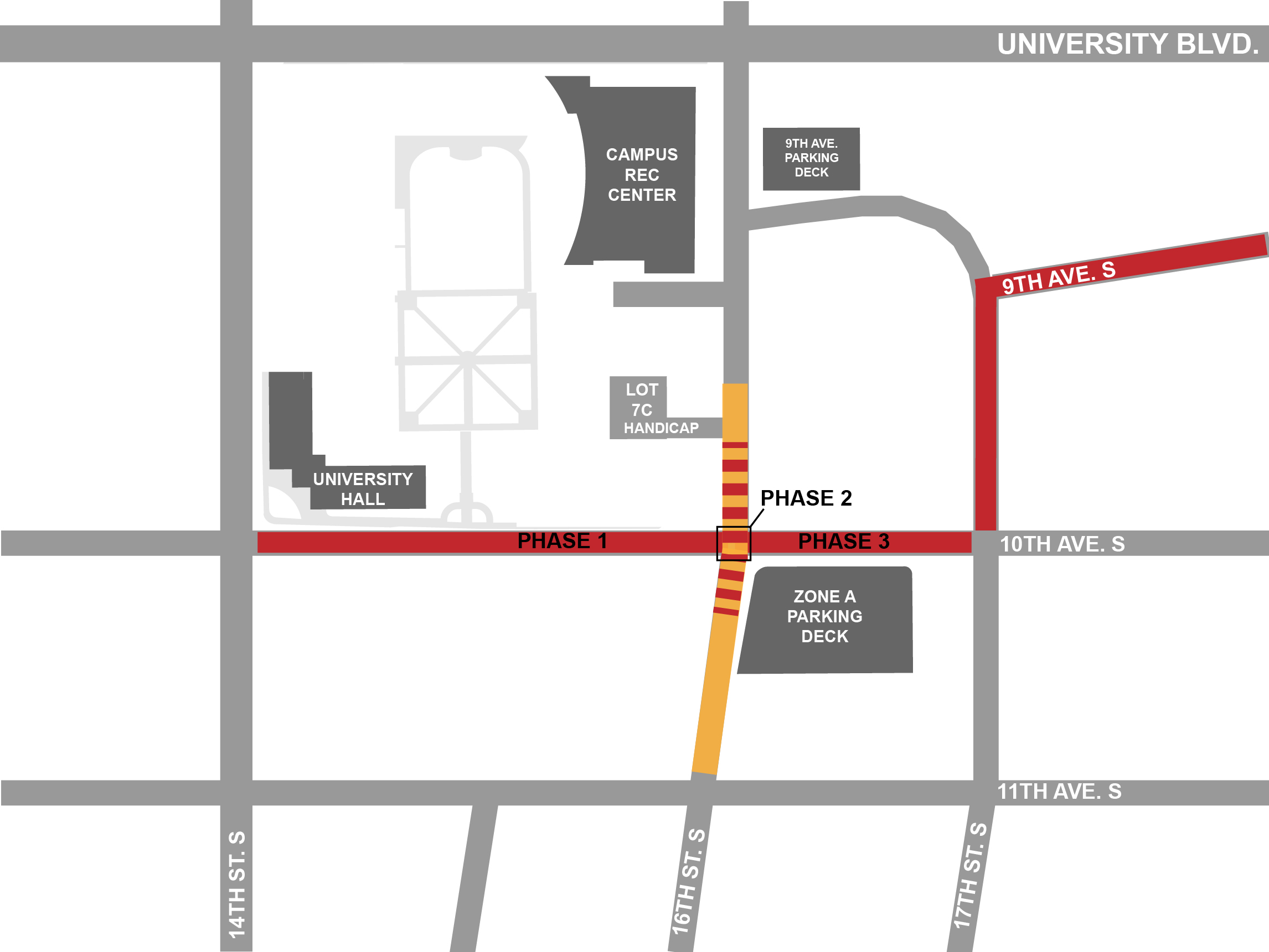 - Lot 7C / Handicap Parking: Access to the handicap parking lot and drop off area, on 16th Street South, between Camp Hall and Blazer Hall, will be accessible to traffic traveling south on 16th Street South. Traffic exiting this lot will need to turn left and travel north on 16th Street South, toward University Boulevard, during Phase 2 construction.