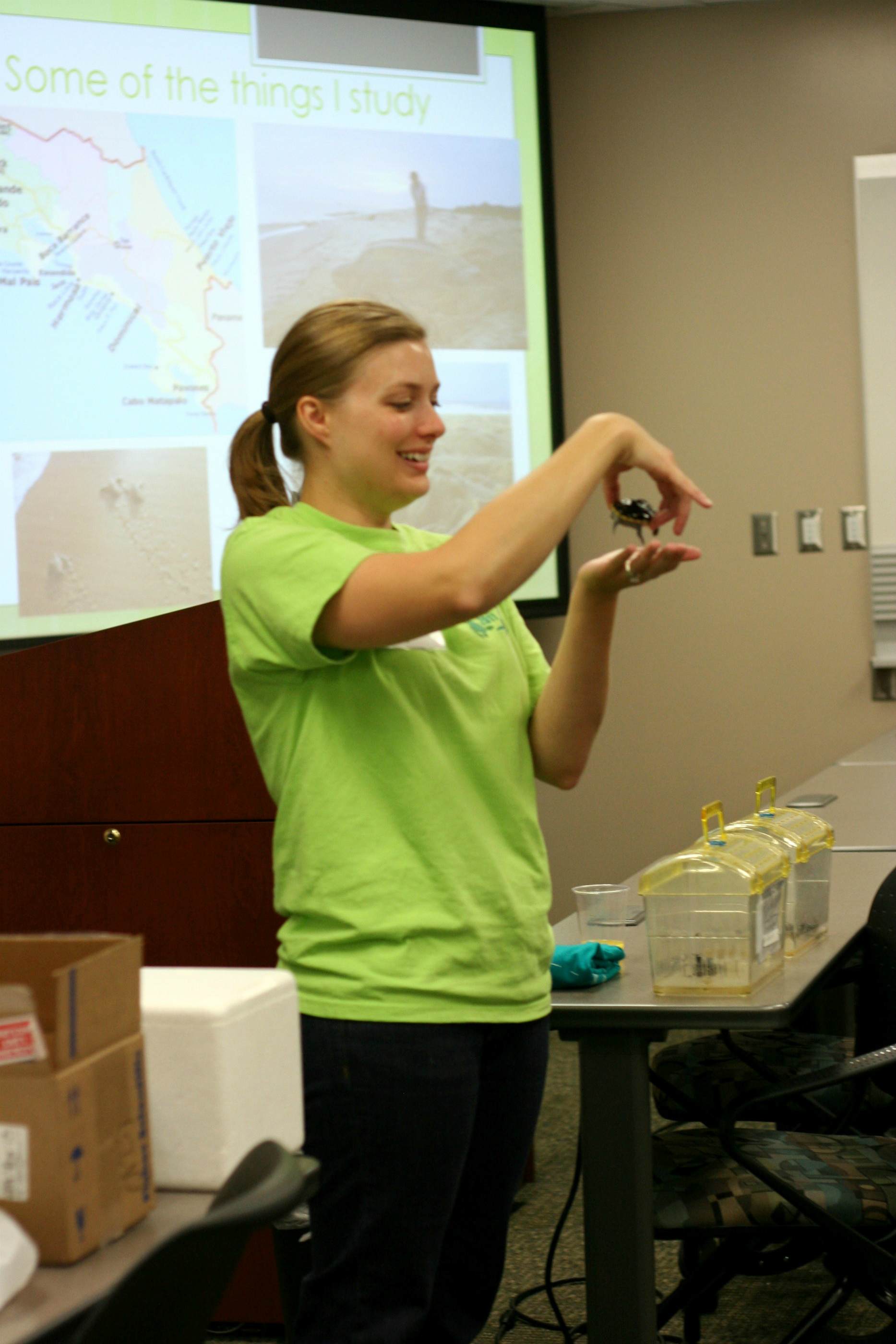 Kayla BieserJob: I am a student and Ph.D. candidate in the Department of Biology at UAB. As a Ph.D. student I do research in the lab, take classes, and teach biology labs to other students. How I use science: Turtles do not have sex chromosomes like humans do (XX is a girl and XY is a boy in humans) to determine if they will be a girl or boy turtle. Instead their sex (girl or boy) is determined based upon the incubation temperature of the turtle egg. Biologists know that temperature determines the sex of the turtle embryo, but they do not know how temperature acts to determine the sex. Therefore, I use science to study the genes in turtle embryos to learn how they regulate sex. This research is important because many species of sea turtles are endangered and at risk of extinction in part due to global climate change. Learning more about how their sex is determined may help us to save and protect these species. Fun fact: You cannot tell the gender of a young turtle (whether it is a boy or a girl) just by looking at it. It is hard to tell the gender even in some adults turtles. Features you would look for to decided if a turtle is a girl or boy are the size of the tail, the length of their nails, the shape of their belly (the plastron), and the size of the turtle.![]() |
