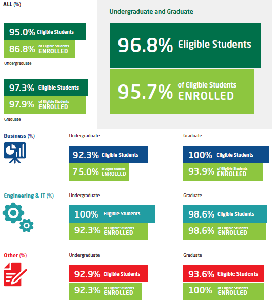 96.8% of all Pathway students were eligible to progress at UAB in 2017-18. Eligible students are those who successfully completed the Pathway program and qualified for admission as degree-seeking students. Enrolled students are those who enrolled as degree-seeking students in their next term of degree study at The University of Alabama at Birmingham.