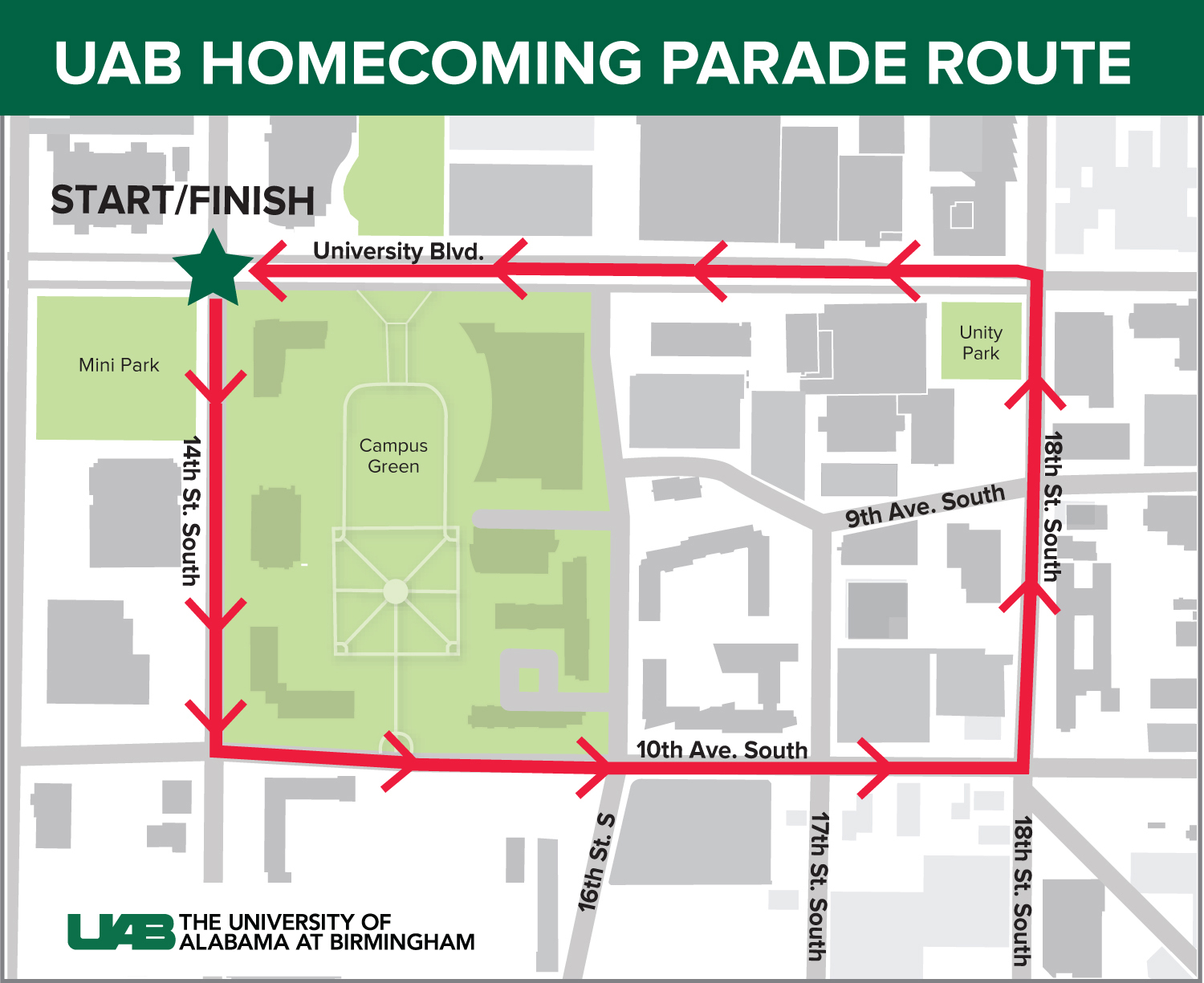 - Line-up begins no earlier than 10:00 a.m. on 14th Street South. All participants should enter from University Blvd to check in.