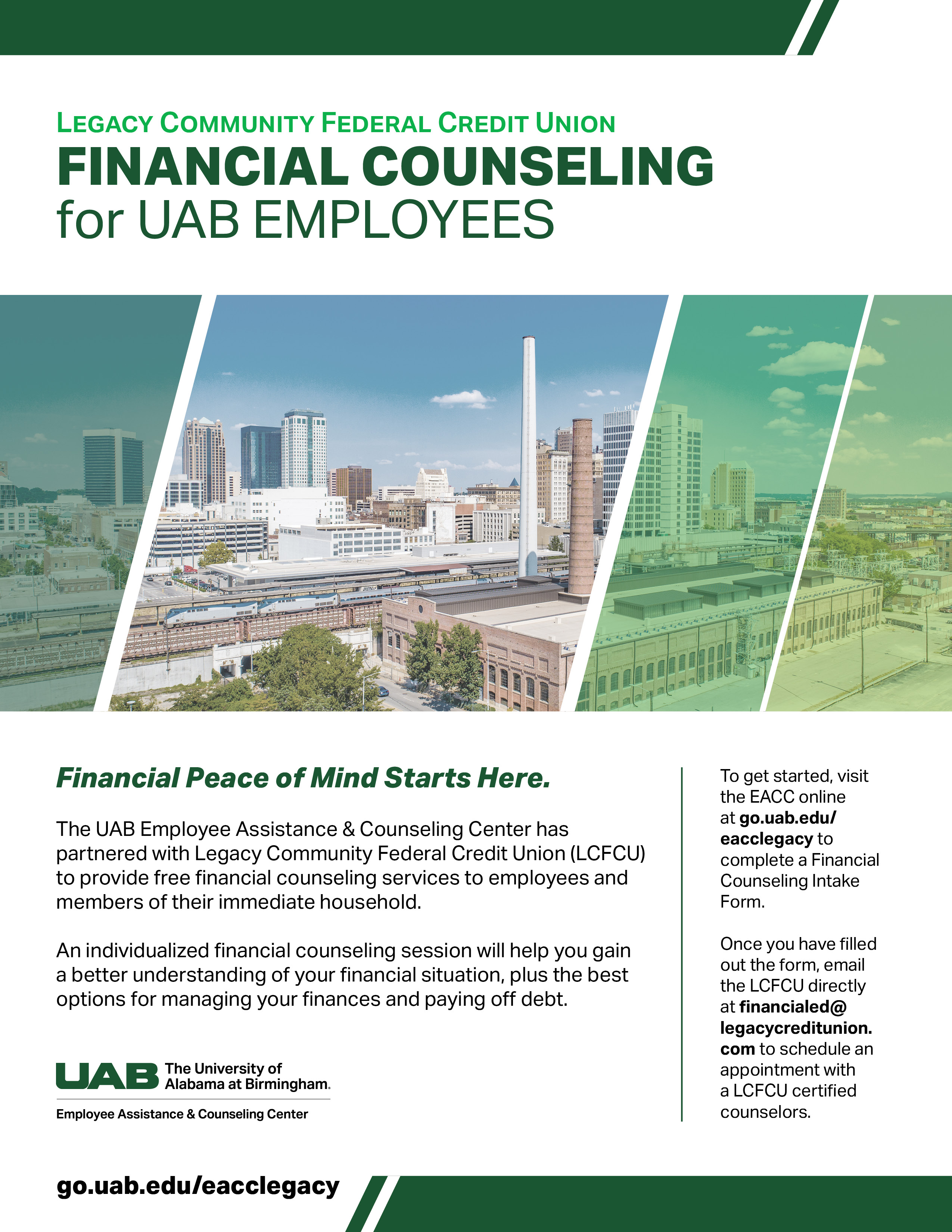 The UAB Employee Assistance & Counseling Center has recently partnered with Legacy Community Federal Credit Union (LCFCU) to provide financial counseling services to employees and their immediate household members.