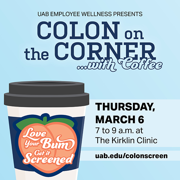 Mark your calendar for UAB Employee Wellness' annual colorectal cancer awareness event, featuring free Red Cat Coffee and the 16-foot inflatable colon, plus colorectal health information from Employee Wellness and its partners.