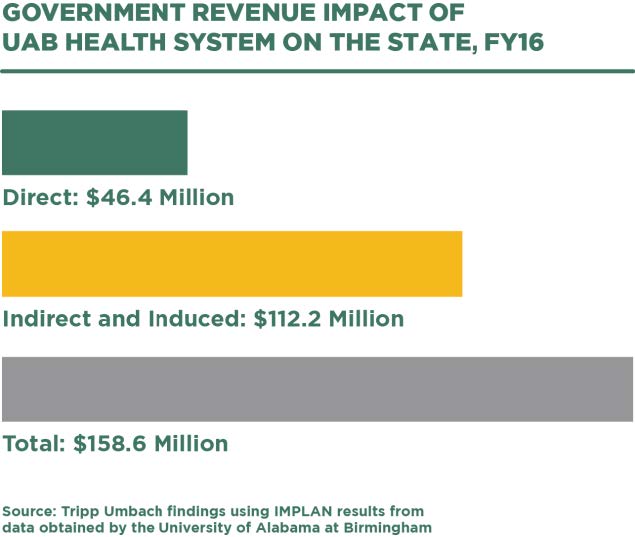 State and local tax revenues attributable to the UAB Health System’s presence totaled $138.5 million ($14 million in direct impact and $124.5 million in indirect and induced impact) in FY22 for the Birmingham region.