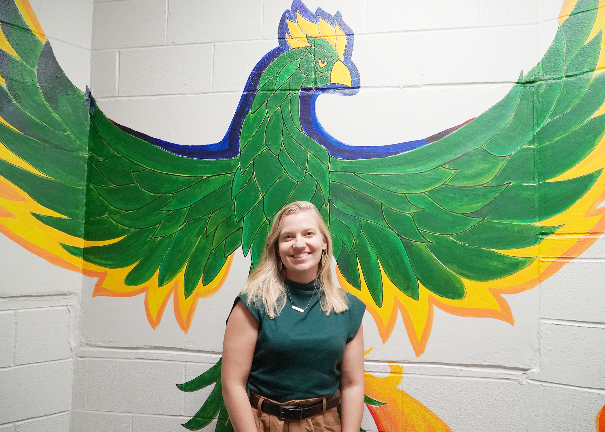 Viikinsalo’s mural, which is located in SEHS’s main stairwell, features a phoenix rising in green and gold and is titled “Non Sum Qualis Eram,” or “I am not who I used to be.” Viikinsalo said the phoenix symbol resonated with her personal evolution and the transformative nature of education. “It captures me and how I’ve changed since I first came to UAB. I’m constantly evolving.”