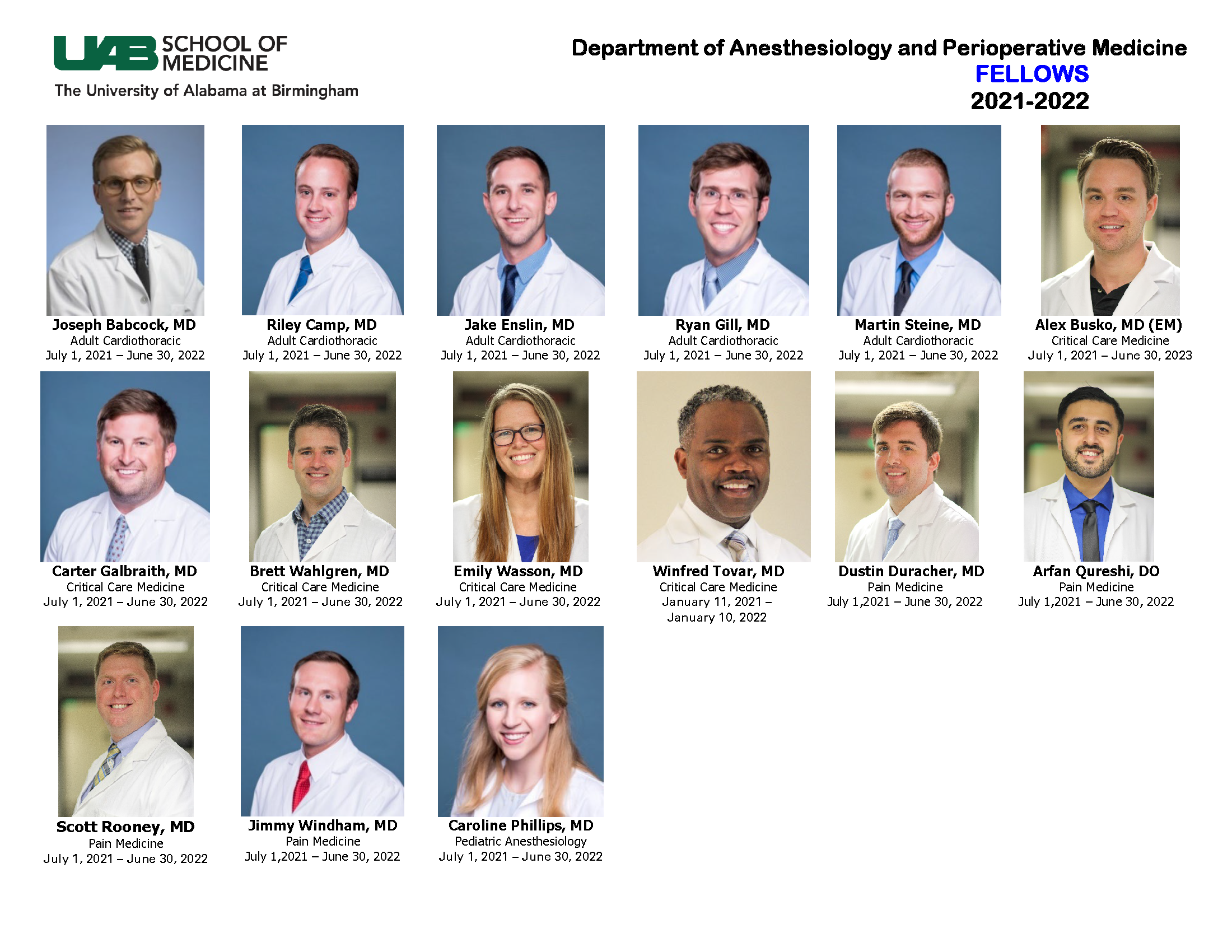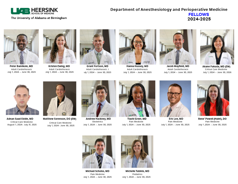 Selection of fellows is based on written applications, academic records, scholarly activities, and interviews. All fellows have office space, 24-hour access to our anesthesia library and university library, and statistical and administrative support. Our comprehensive didactic program includes departmental grand rounds, journal club, and weekly lecture series, contributing to a well-balanced educational and clinical experience. We believe our growth and forward-thinking approach to the challenges and opportunities for the future will give our fellows a distinct advantage. Our fellows join UAB from training programs around the country as well as from our own residency program.