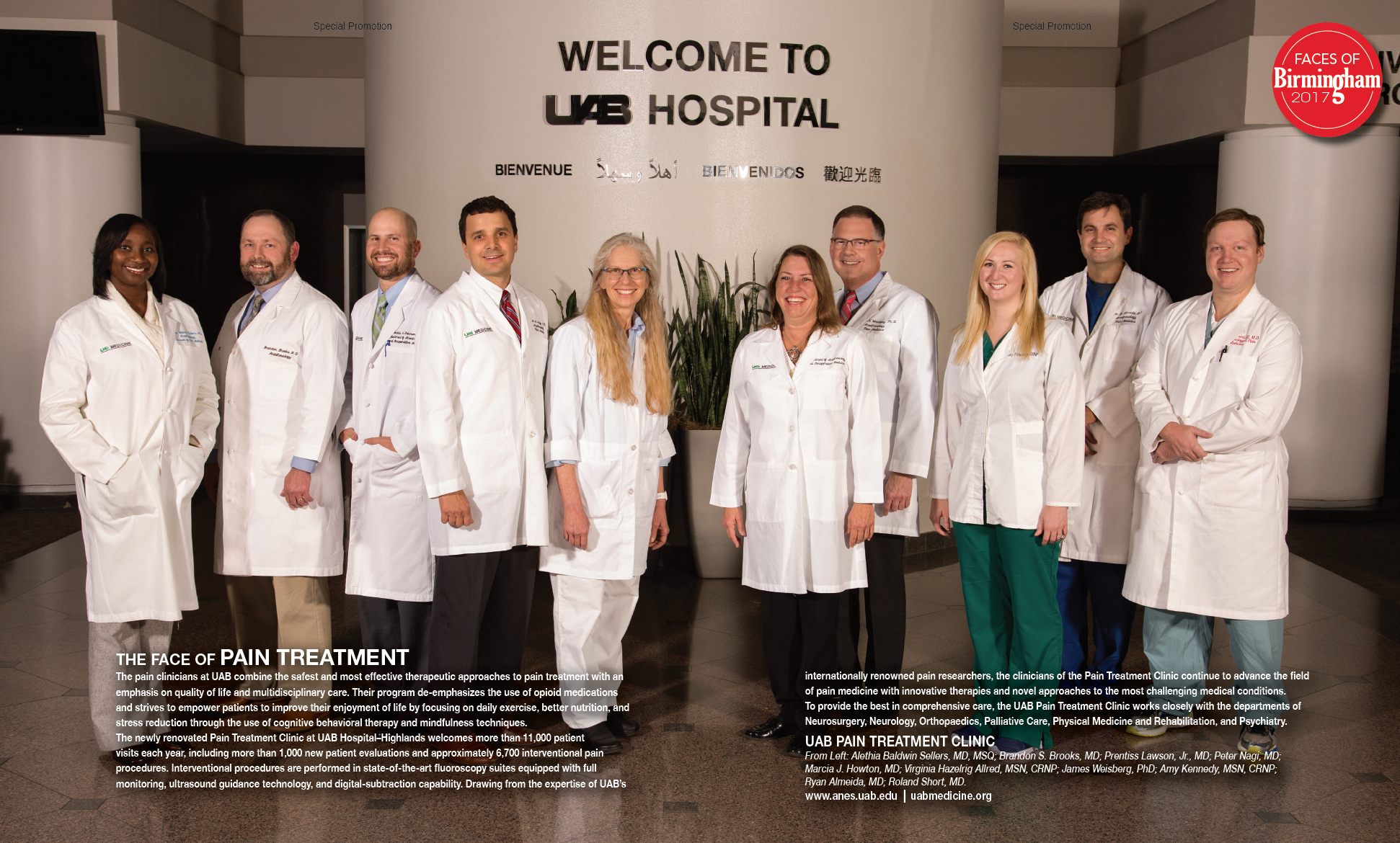 From Left: Alethia Baldwin Sellers, MD, MSQ; Brandon S. Brooks, MD; Prentiss Lawson, Jr., MD; Peter Nagi, MD; Marcia J. Howton, MD; Virginia Hazelrig Allred, MSN, CRNP; James Weisberg, PhD; Amy Kennedy, MSN, CRNP; Ryan Almeida, MD; Roland Short, MD.Our physicians and nurse practitioners from the UAB Pain Treatment Clinic were recently in B-Metro magazine. What a talented and great-looking bunch!