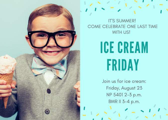 Come celebrate the last Ice Cream Friday of the summer with us! Stop by NP 5401 2-3 p.m. or BMR II 3-4 p.m. on Friday, August 23 for a sweet treat.