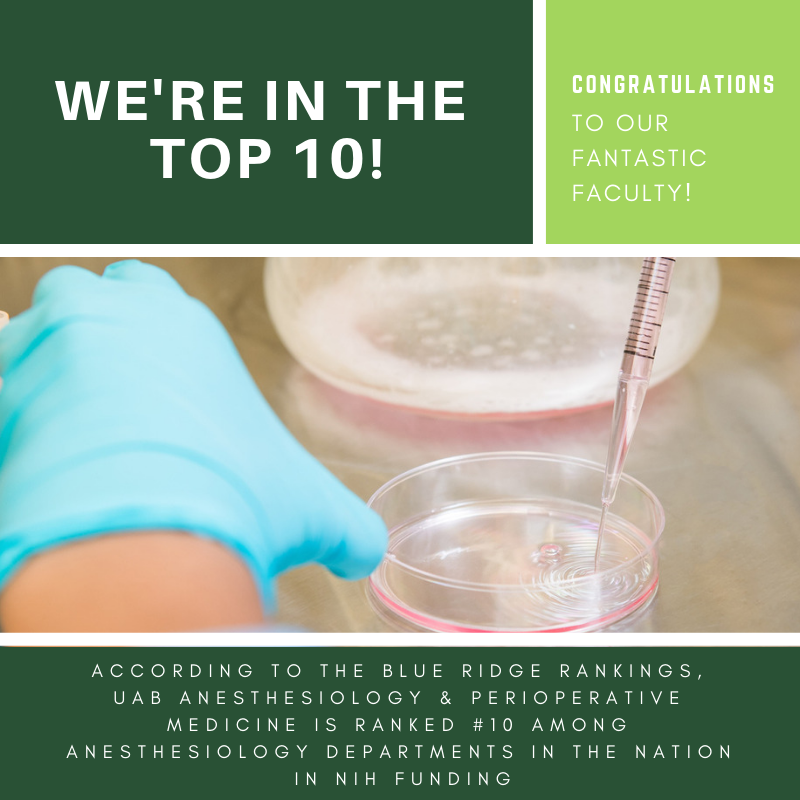 It is with great excitement and honor that I introduce myself as the new Chair of the Department of Anesthesiology and Perioperative Medicine at UAB. I am grateful to be part of a rich tradition of esteemed chairs who have built this Department to its current state of excellence. The Department is humming. The clinical operation has grown dramatically, providing service to multiple anesthetizing locations. The incorporation of ERAS protocols, and a dashboard that measures quality metrics in real time, ensures the highest-quality patient care and efficiency. We direct and provide care in most of the ICUs in the institution and are dedicated to preoperative evaluation, habilitation, and optimization in our PACT. Both the translational and clinical research enterprise receives more than $5 million in funding from the NIH, making it a top 10 department in the country. Our resident and fellow education is legendary and progressive, ensuring that we train outstanding consultants who become leaders in our field.