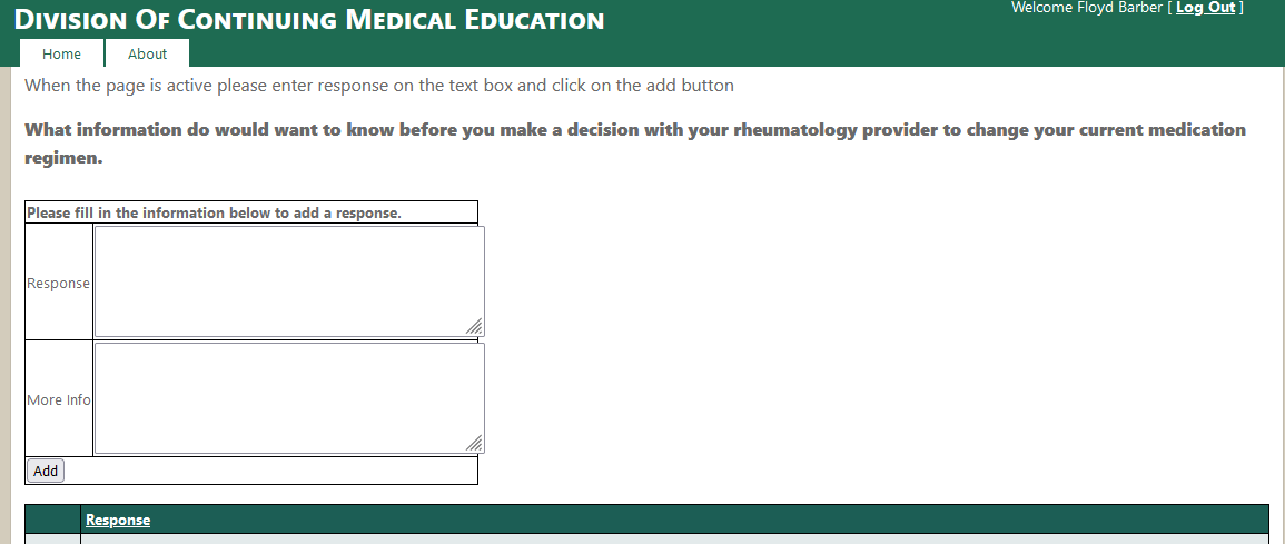 - Enter a response into the "Response" area and up to 6 responses to the question and then select Add immediately below the "More info" box.