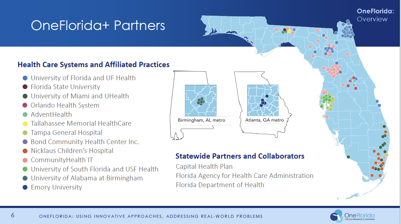 The OneFlorida+ Clinical Research Network is a collaboration among researchers, clinicians and patients in Florida, Georgia and Alabama to create an enduring infrastructure for a wide range of health research, including pragmatic clinical trials, comparative effectiveness research, implementation science studies, observational research, and cohort discovery. Network partners include the University of Florida, Florida State University, the University of Miami, the University of South Florida, Emory University in Atlanta, and the University of Alabama at Birmingham, along with the six universities’ affiliated health systems and practices. Other partners include AdventHealth (Orlando), Tallahassee Memorial HealthCare, Tampa General Hospital, Bond Community Health (Tallahassee), Community Health IT (Kennedy Space Center), Nicklaus Children’s Hospital (Miami), Capital Health Plan (Tallahassee), Bendcare (Boca Raton, Florida) and the Florida Agency for Health Care Administration, which oversees the Florida Medicaid Program.