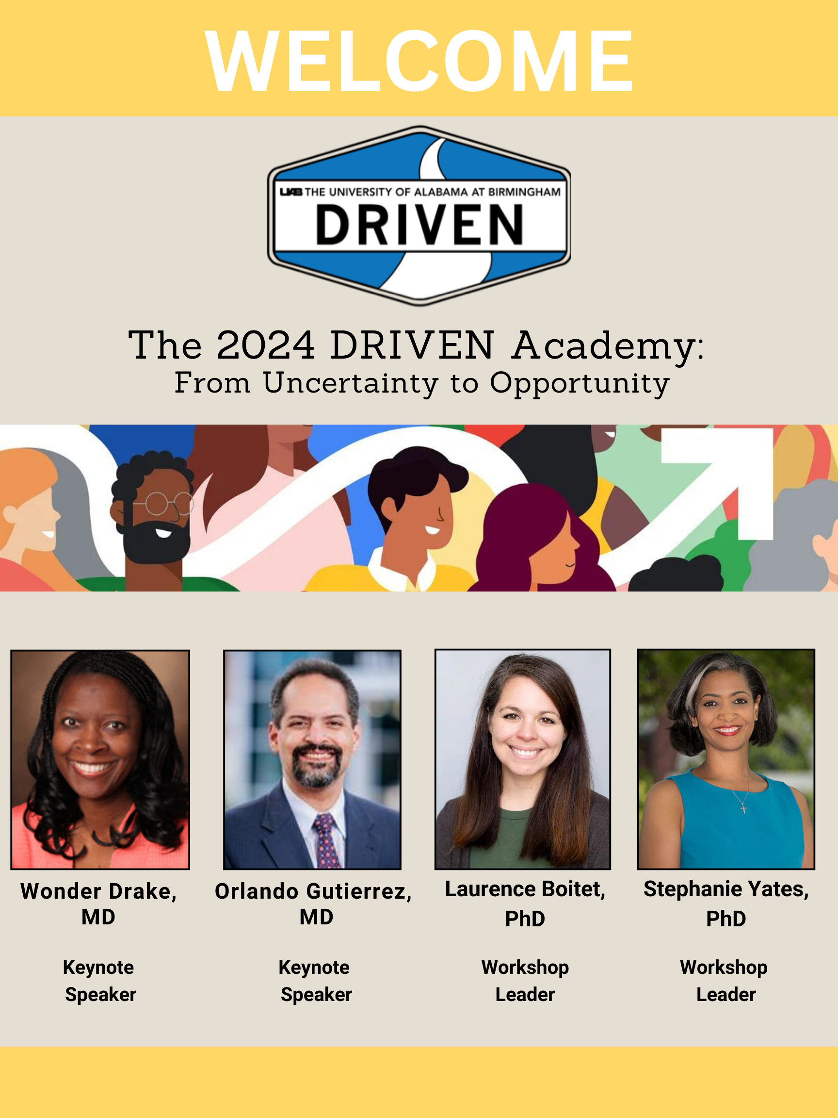 The 2024 DRIVEN Academy: From Uncertainty to Opportunity is a 1.5-day, in-person event, focused on supporting the growth of early-career, research-interested faculty and instructors. All who are interested in attending the DRIVEN Academy are encouraged apply.” The event will be held September 19 to 20. This year’s Academy includes an afternoon networking reception on September 19 and The DRIVEN Academy on September 20. Keynote speakers Dr. Wonder Drake, Director, Sarcoidosis Program and Senior Associate Dean for Faculty Affairs at the University of Maryland School of Medicine and Dr. Orlando Gutierrez, Director, Center for Clinical and Translational Science and Director, Division of Nephrology at UAB. Drs. Laurence Boitet and Stephanie Yates will lead workshops on leadership and building a financial plan.