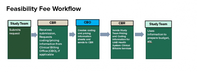 Feasibility Fee Request: To submit a Feasibility Fee Request, fill out the appropriate information in the online Redcap application. Please make sure to list the UAB Health System Clinical Billable Services for which you need pricing, and the location of the service.