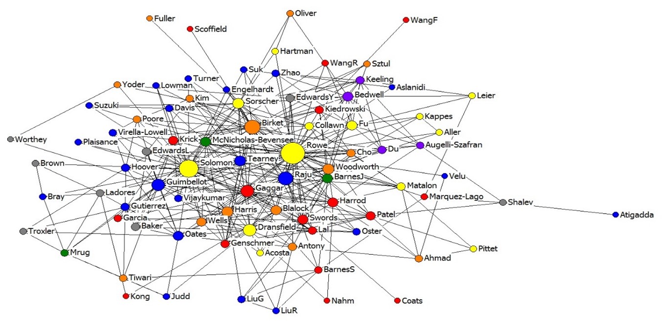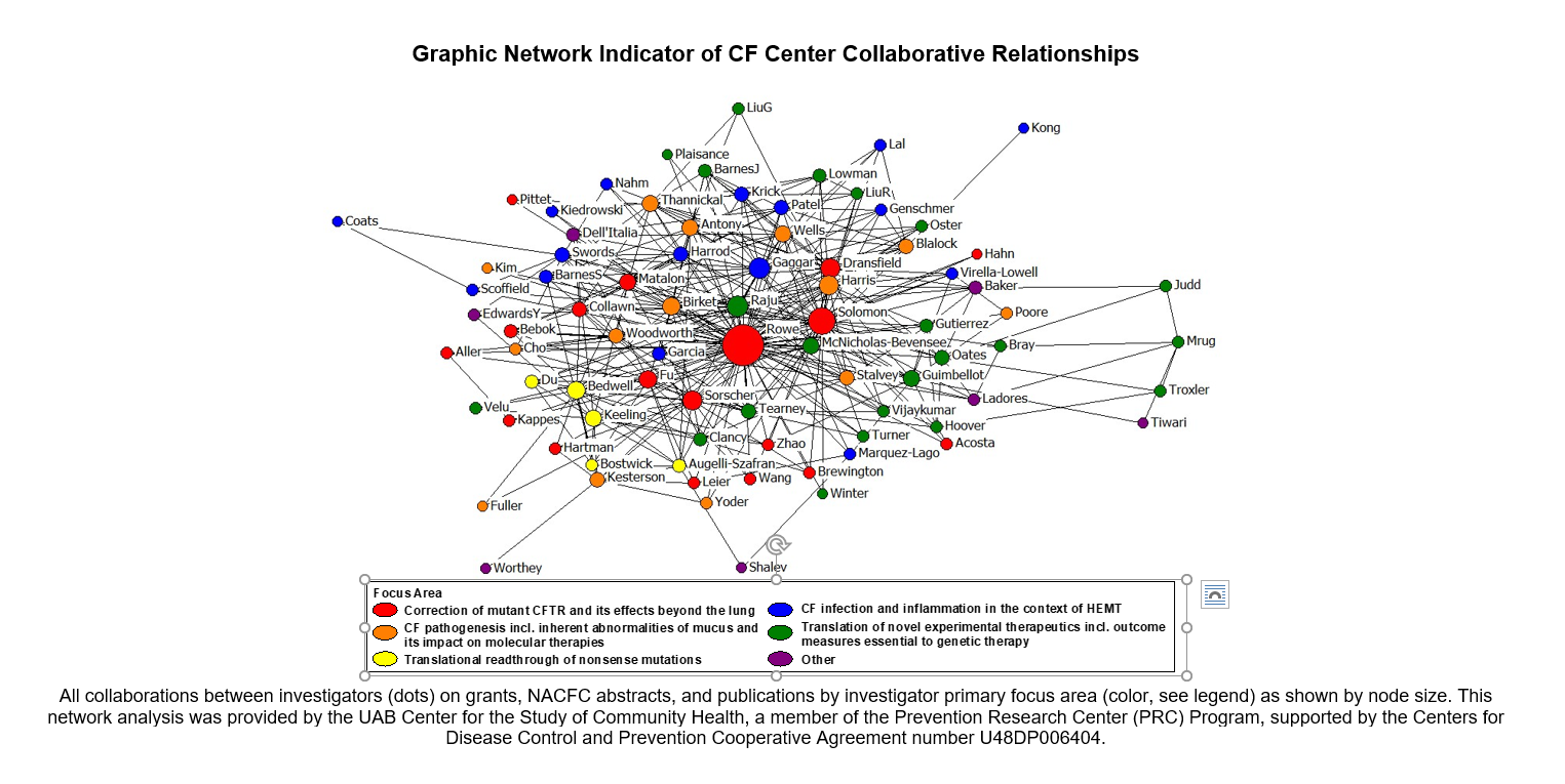 All collaborations between investigators (dots) on grants, NACFC abstracts, and publications by investigator primary focus area (color, see legend) as shown by node size. This network analysis was provided by the UAB Center for the Study of Community Health, a member of the Prevention Research Center (PRC) Program, supported by the Centers for Disease Control and Prevention Cooperative Agreement number U48DP006404.