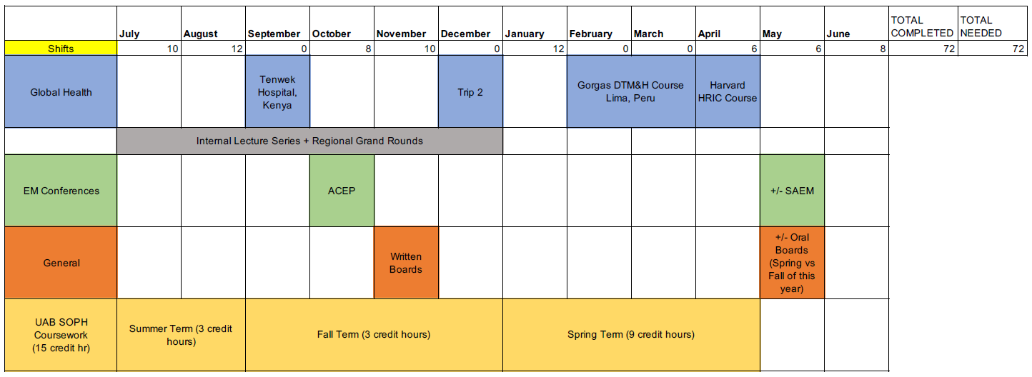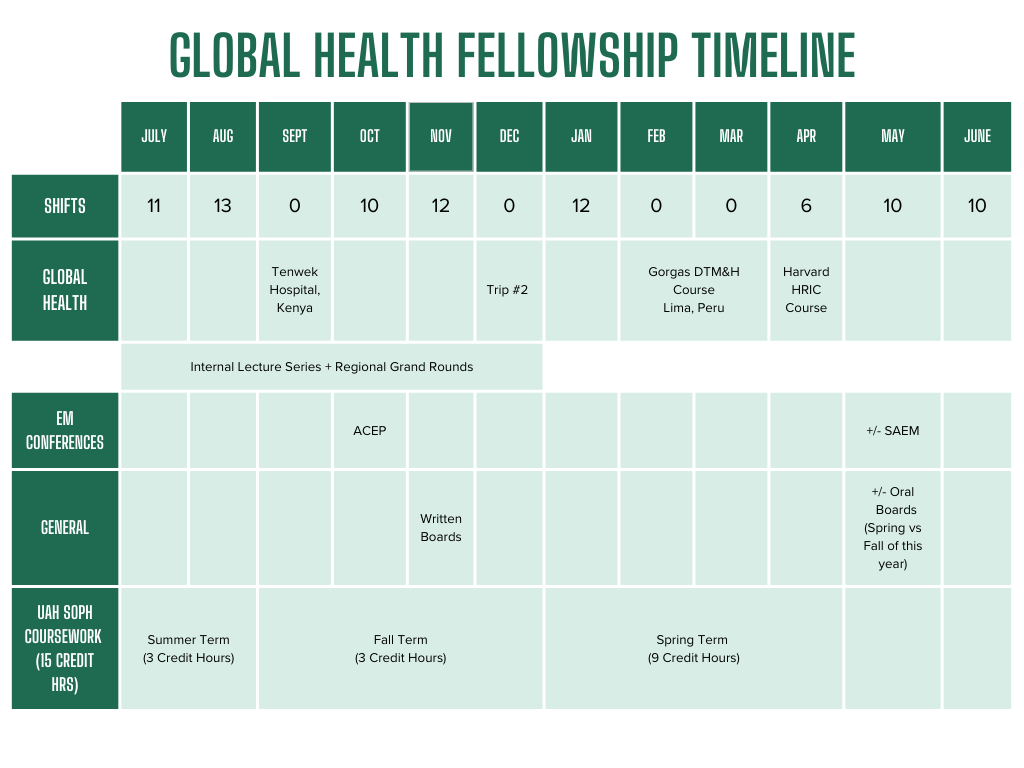 The Global Emergency Medicine fellowship can take place over one or two years. Those who choose to complete the fellowship in one year will earn a Global Health Certificate through the UAB School of Public Health. Those who choose to complete a two-year fellowship will earn a master's degree in global health or equivalent.