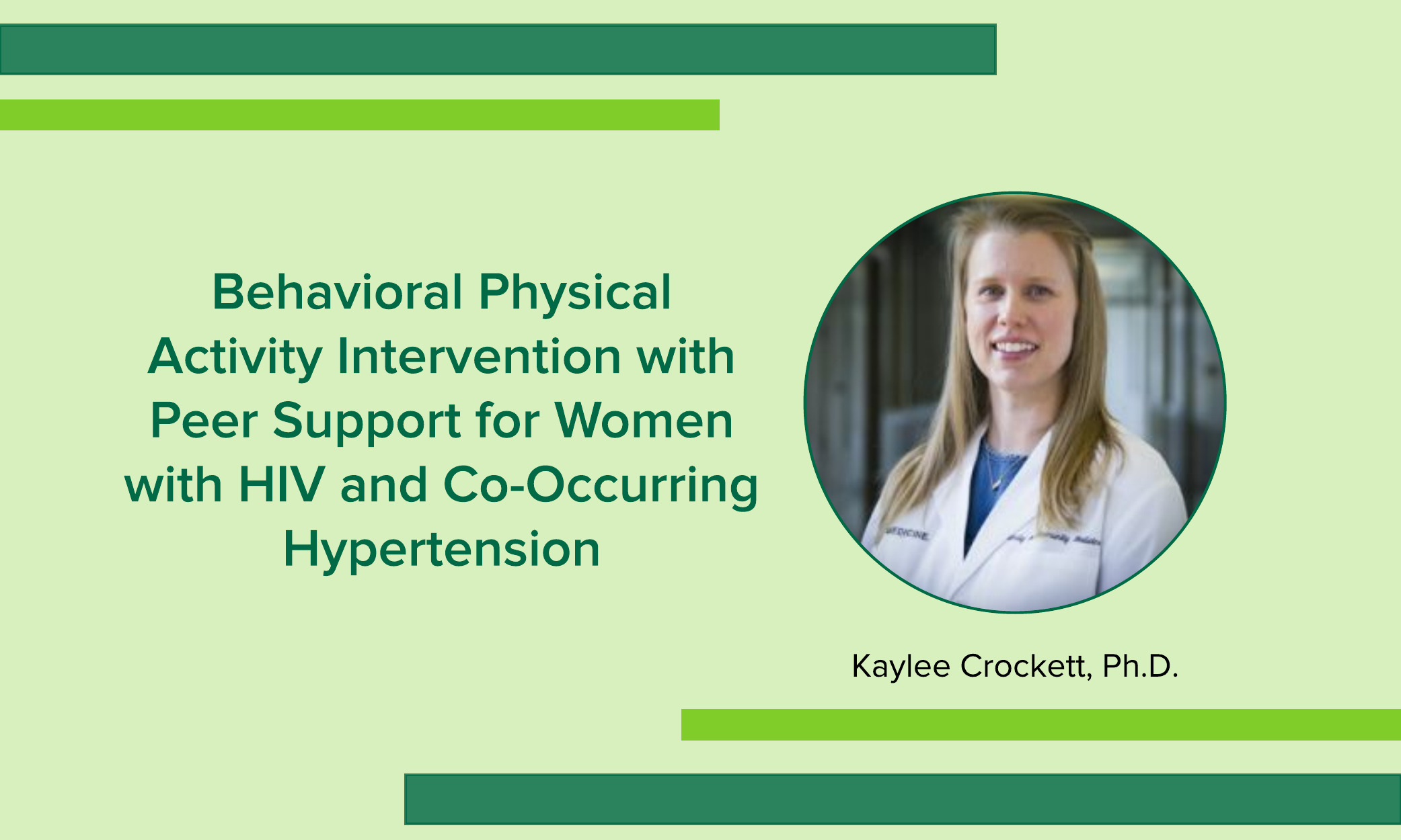 In 2021, Kaylee B. Crockett, Ph.D., clinical psychologist and assistant professor, received a Mentored Patient-Oriented Research Career Development (K23) award from the National Heart Lung and Blood Institute for research focused on adapting a behavioral physical activity intervention with peer support for women with HIV and co-occurring hypertension.