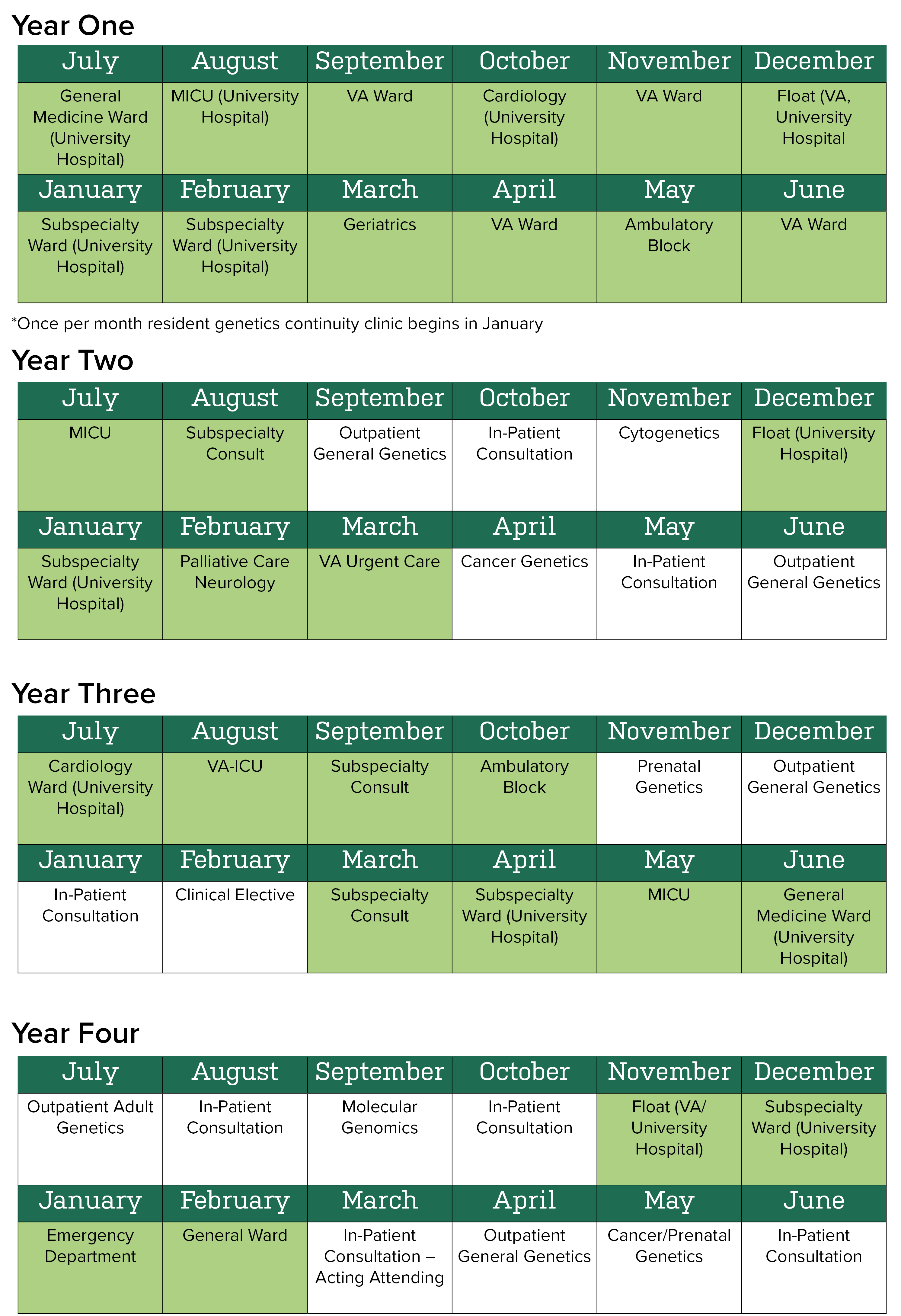 During months on Internal Medicine rotations, the resident will average a half-day-per-month genetics follow-up clinic as well as an Internal Medicine continuity clinic; during months on Genetics rotations, the resident will have two half-day-per-month genetics follow-up clinics as well as four half-days per month of Internal Medicine continuity clinic.