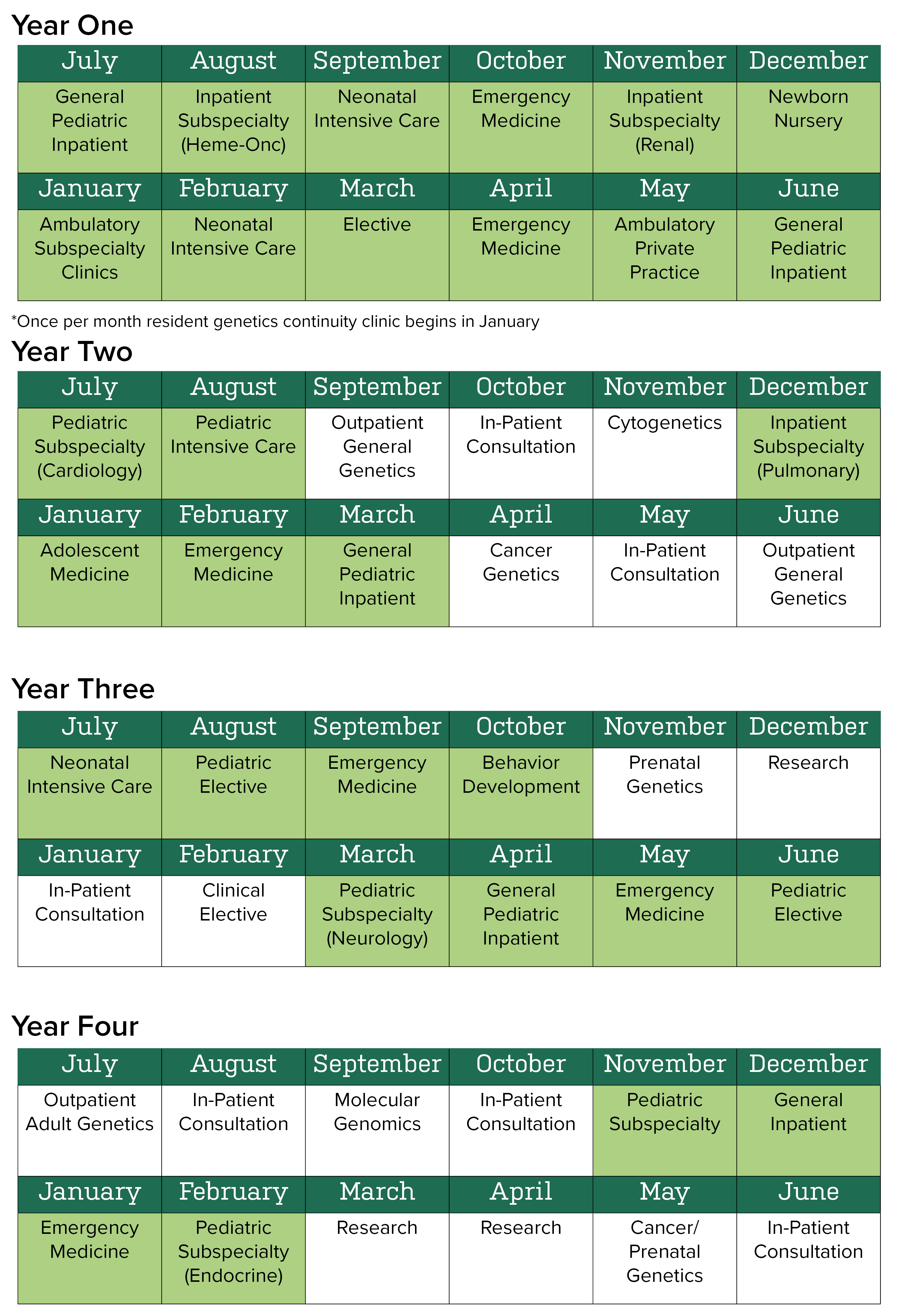 The resident is board eligible for pediatrics and clinical genetics at the conclusion of year 4.Notes: