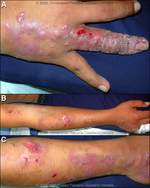 The following patient was seen in the outpatient department of the 36-bed Tropical Disease Unit at Cayetano Heredia National Hospital. ![]() History: 21 year-old male with painless skin lesions restricted to the right arm. The initial lesion began from the base of the nail of the 4th finger 3 months earlier that progressed to multiple non-pruritic popular and ulcerative lesions which have continued to spread and progress. Some nodules ulcerated with a clear yellowish discharge. No history of fever, general malaise, weight loss or any constitutional symptom. No specific recollection of any traumatic lesion. Epidemiology: Patient was born and lives in the highlands of Cajamarca. He works as a corn farmer, but also raises cattle, chicken, guinea pigs and dogs. No ill contacts, no relevant family history, no TB contact. Physical Examination: Afebrile. Physical examination normal except for right arm as shown in Images A-C. Right epithroclear but not axillary lymphadenopathy. Laboratory Examination: Normal Chest X-ray. Specimens from the lesions were sent for stain, culture and histology.