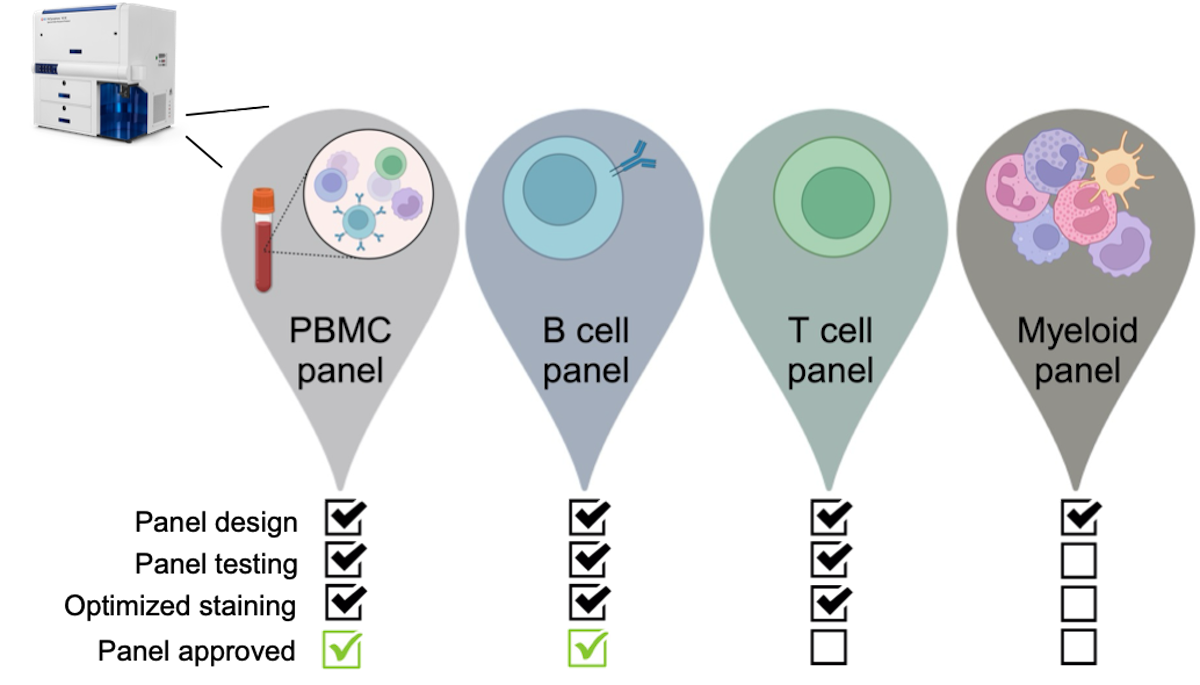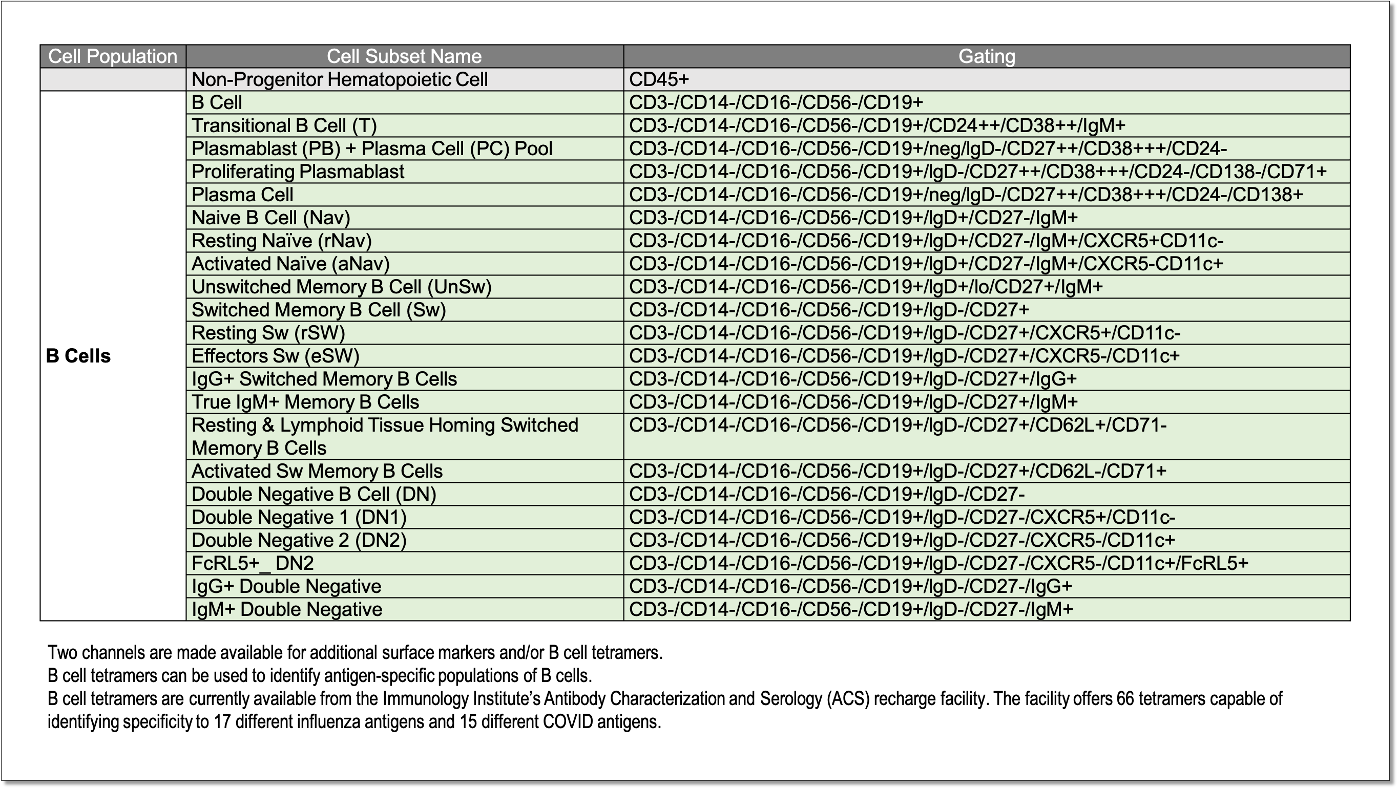 Identification of 23+ human B cell subpopulations using the B cell panel