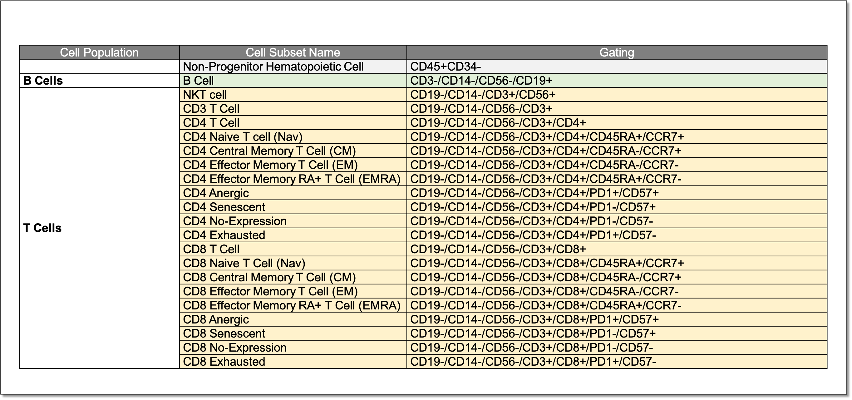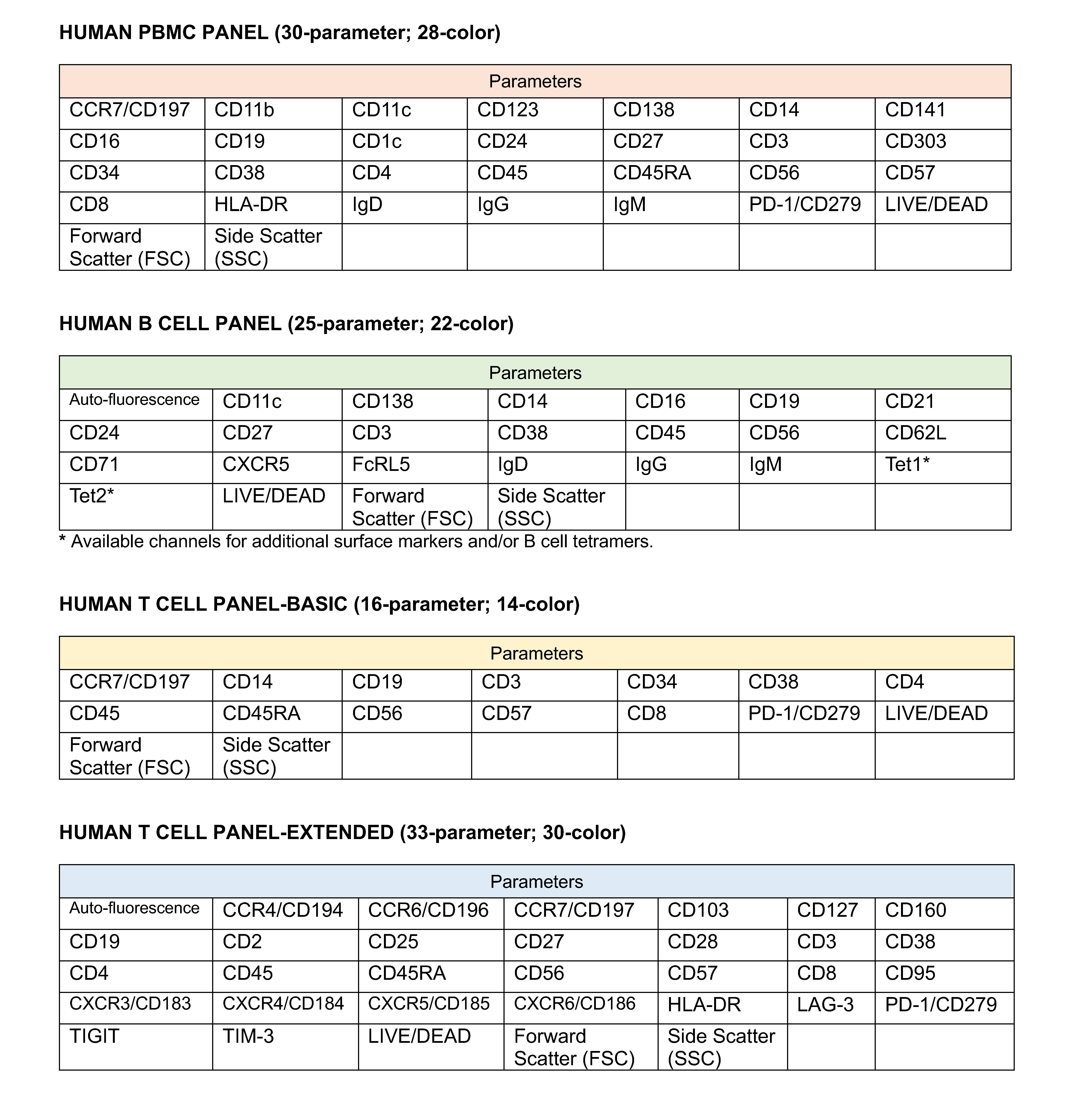 Composition of our validated PBMC, B cell and T cell panels