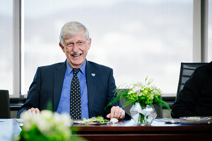NIH Director Francis Collins ate lunch with graduate students, post docs, and Medical Scientist Training Program students during his March visit to UAB.