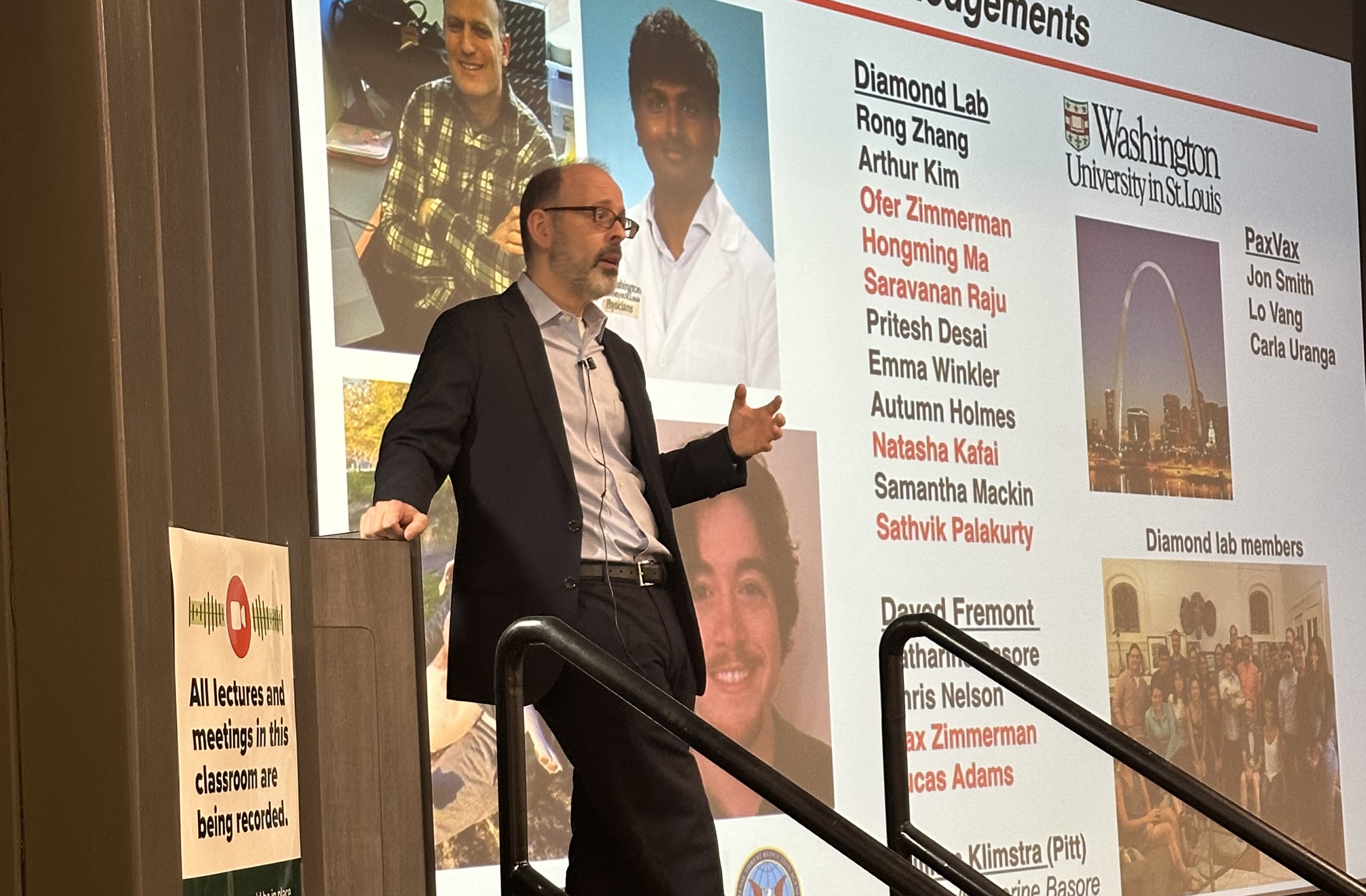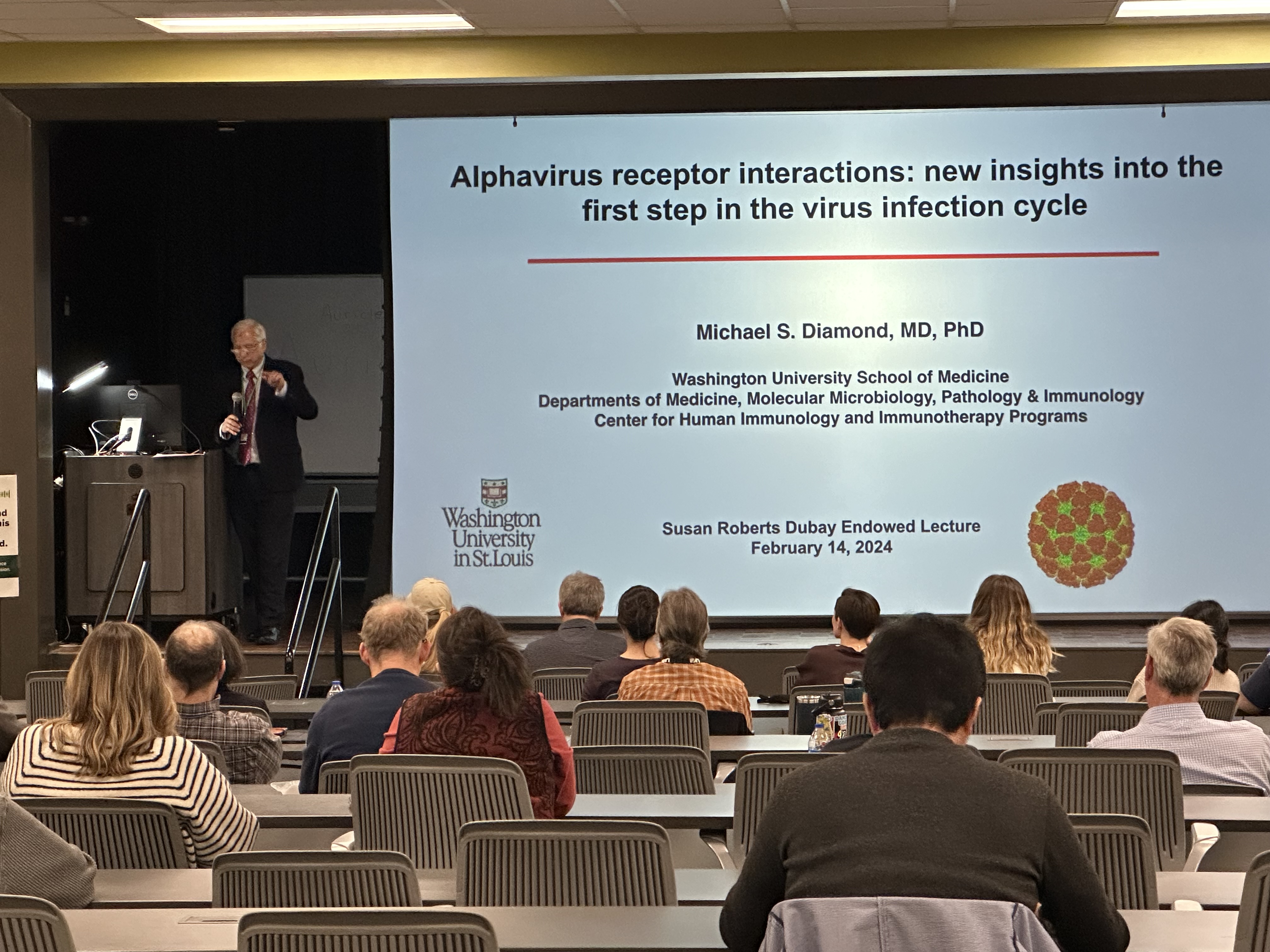 The 2024 Susan Roberts Dubay Endowed Lecture hosted by the UAB Department of Microbiology took place on Wednesday, Feb. 14, in Cudworth, Room 102. Michael S. Diamond, M.D., Ph.D., Herbert S. Gasser Professor at Washington University’s School of Medicine in St. Louis, presented, “Alphavirus receptor interactions; new insights into the first step in the virus infection cycle.”