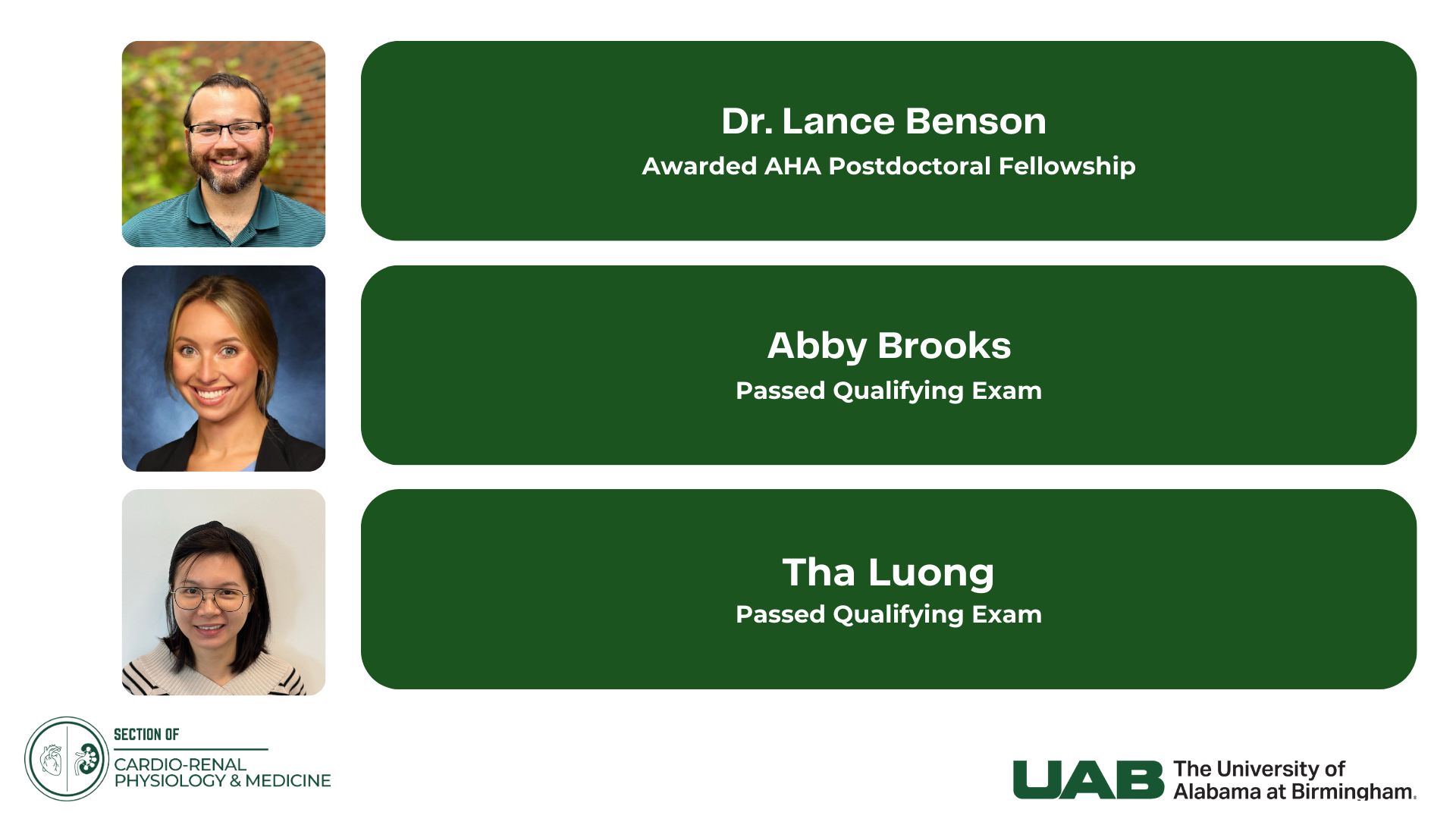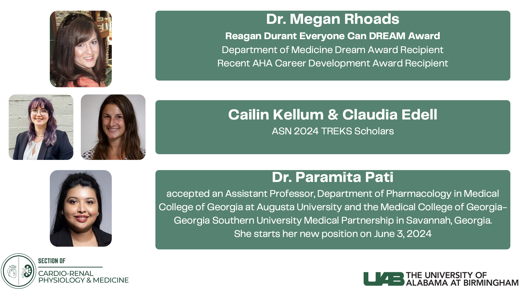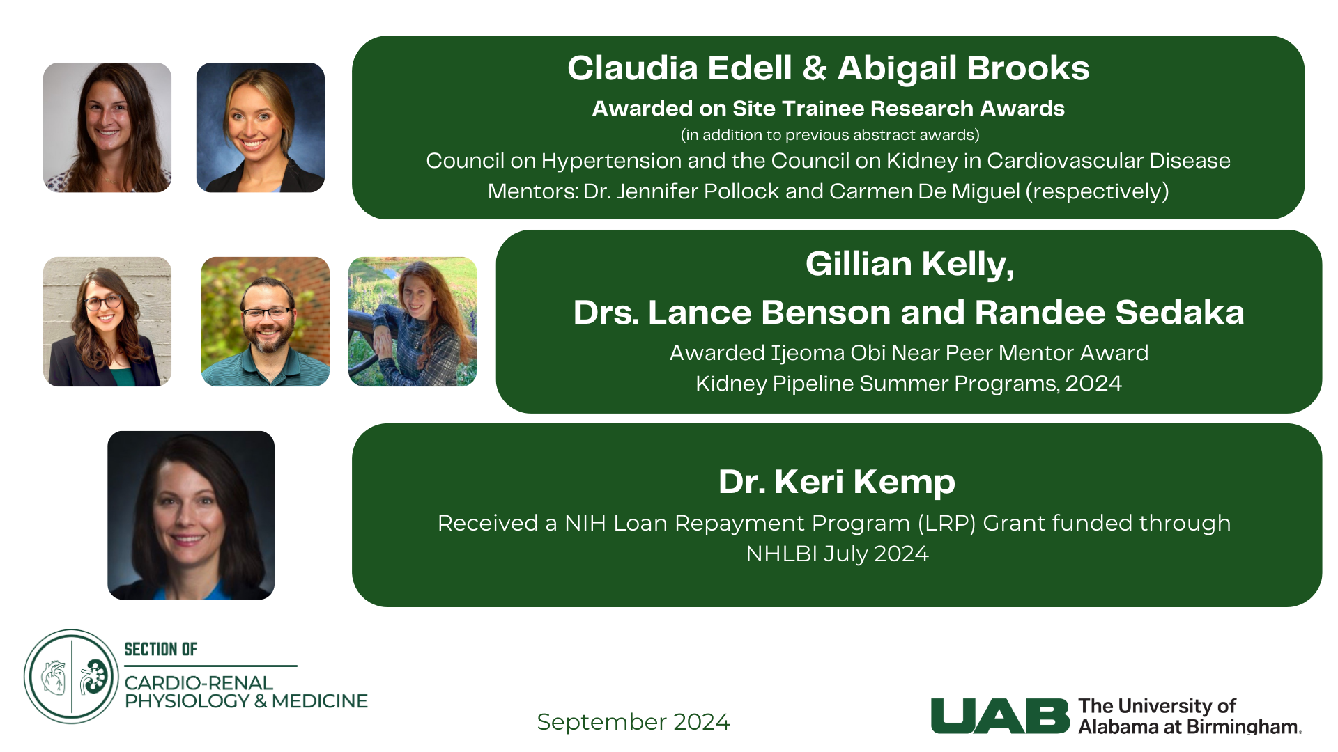 The impact of the CRPM could never have been accomplished without the dedication and engagement of our students, fellows, and collaborating faculty. Importantly, the pipeline for trainees and early career faculty extends from undergraduate students to early career faculty transitioning to independent investigator status. We are especially proud of our faculty who have transitioned from trainees to become world-renowned experts and leaders in Cardio-Renal Physiology & Medicine at UAB and other institutions across the US.