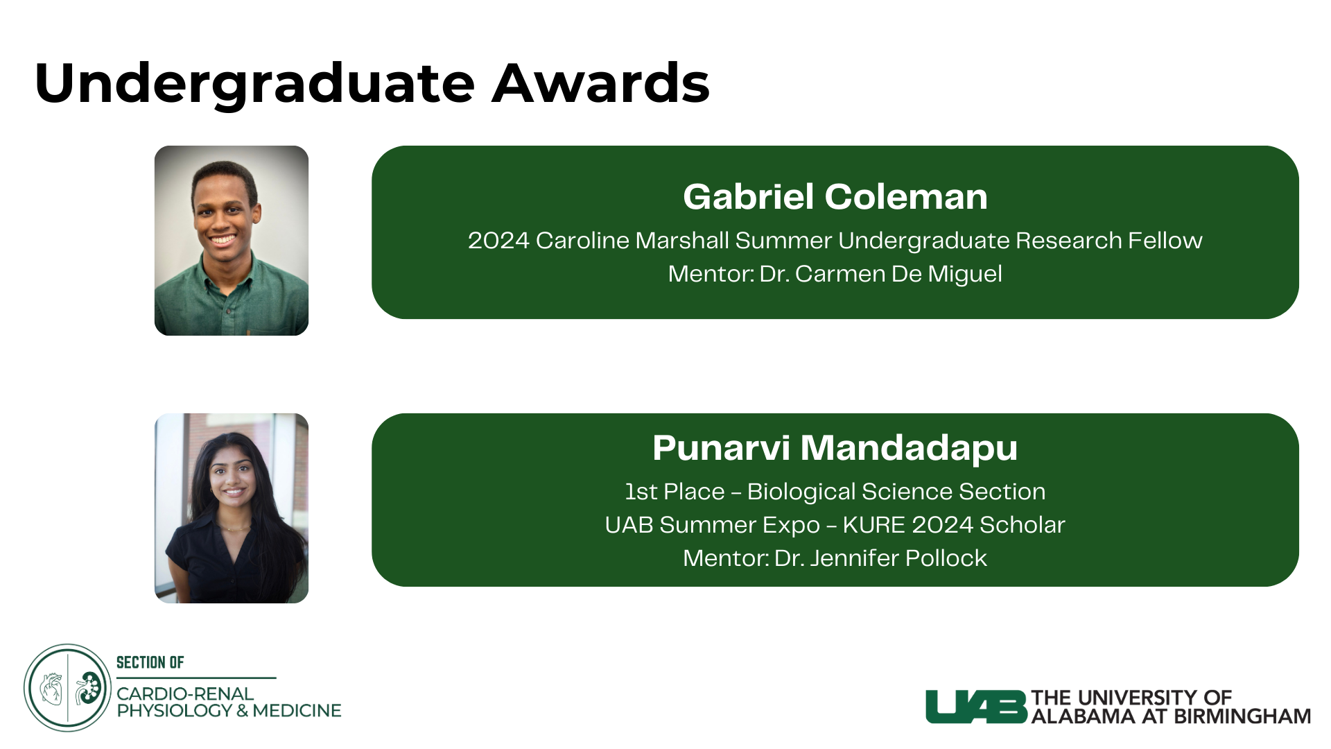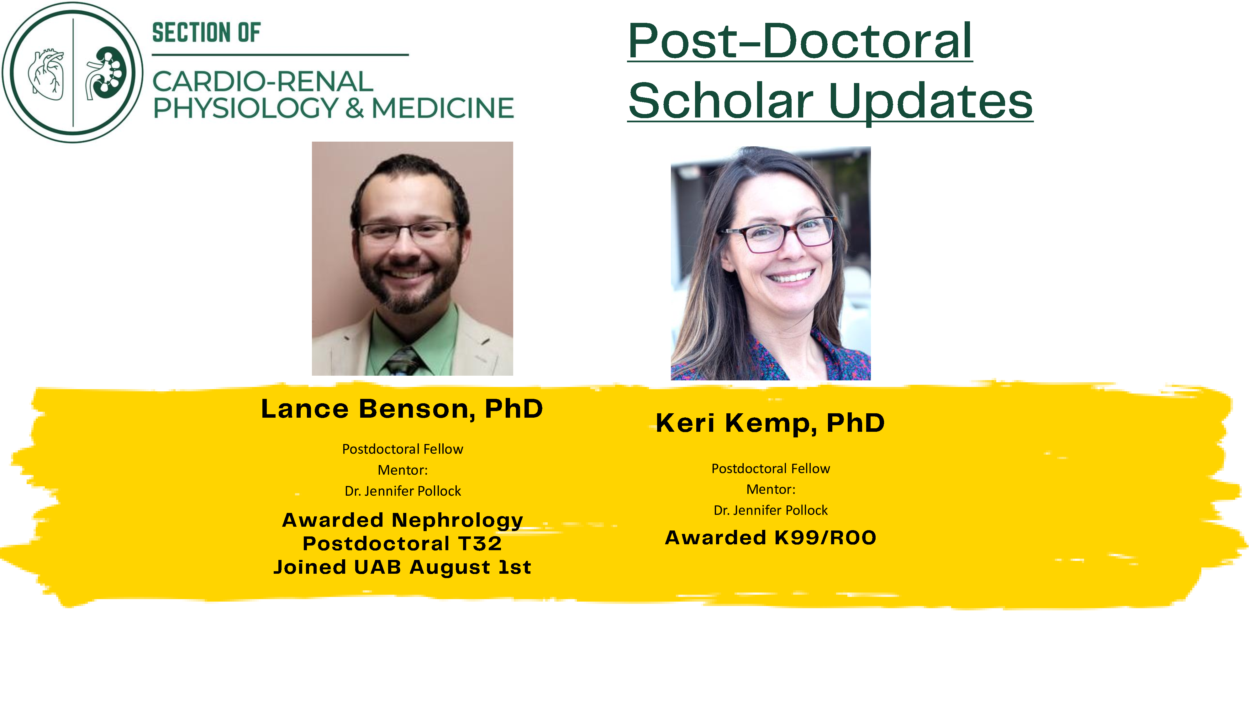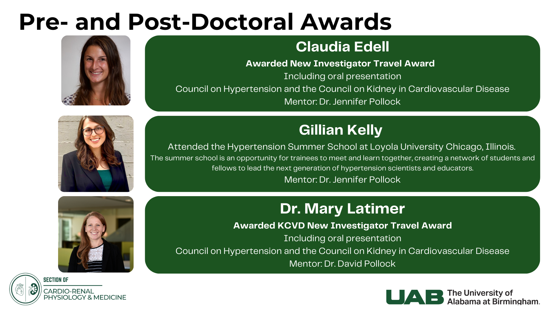 The impact of the CRPM could never have been accomplished without the dedication and engagement of our students, fellows, and collaborating faculty. Importantly, the pipeline for trainees and early career faculty extends from undergraduate students to early career faculty transitioning to independent investigator status. We are especially proud of our faculty who have transitioned from trainees to become world-renowned experts and leaders in Cardio-Renal Physiology & Medicine at UAB and other institutions across the US.