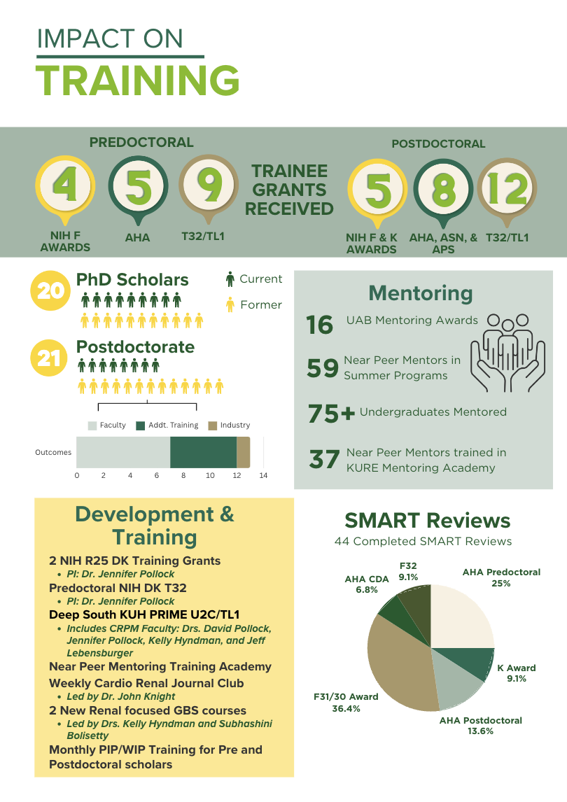 The implementation of the various training programs has built a culture of community for Cardio-Renal researchers and clinicians at UAB. Notably, several of our training programs are supported with extramural NIDDK funding. These activities have sustained success over the past 10 years and are the foundation of the CRPM’s Impact on Training.