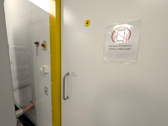 The machine operates in a sealed room with a thick door, which eliminates outside magnetic noise. Patients lie or sit still during the scan, which takes precise magnetic field measurements of brain activity.