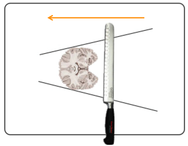 After detaching the brainstem via an axial cut through the midbrain and then making the first brain coronal section cut through the middle of the mammillary bodies, proceed as usual making coronal sections but with the help of the tool