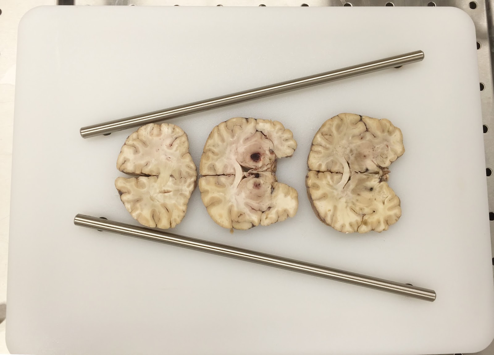 A while ago, as a pathology resident, I was temporarily in charge of organizing the weekly brain cutting activity. During this event I always felt a little bothered by the unpredictability and irregularity that occurred with each cut and the variability of results with each different person trying to pursue the same goal. I decided to do some research trying to find more information about how brain grossing examination was done in different places. To my amazement, I found out about a brain tissue bank in the United Kingdom that performed their coronal sections with the help of a tool. This tool enabled them to create perfect fine cuts every time to perform a complete meticulous evaluation. After knowing about this, I was highly motivated to perform a DIY project. As I optimistically anticipated, the results were excellent. I made the tool usingmaterials that I could easily find in any hardware store. This new and improved tool could now be made by anyone interested in having the same results.