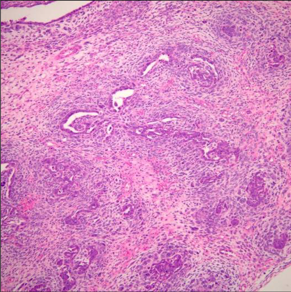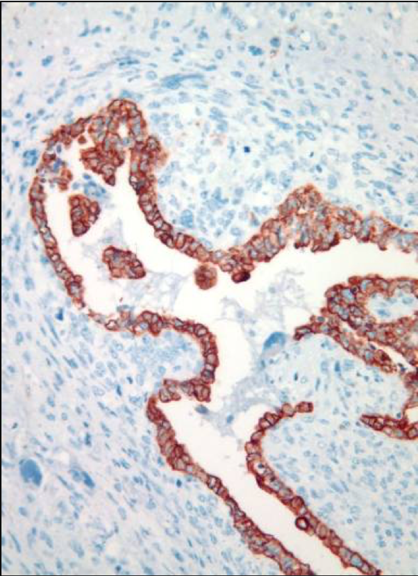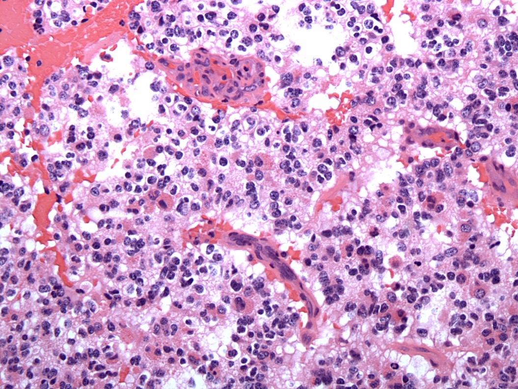 A 64 year-old man with history of clear cell renal cell carcinoma s/p nephrectomy (2021) presents with scrotal pain and firmness. Ultrasound reveals a 2 cm solid lesion. Serum tumor markers (hCG and AFP) were normal. The tumor was negative for SALL4, OCT3/4, AFP, and showed focal patchy positivity for pancytokeratin (focal). PAX8 was weakly positive. Additional stains are displayed in the pictures.