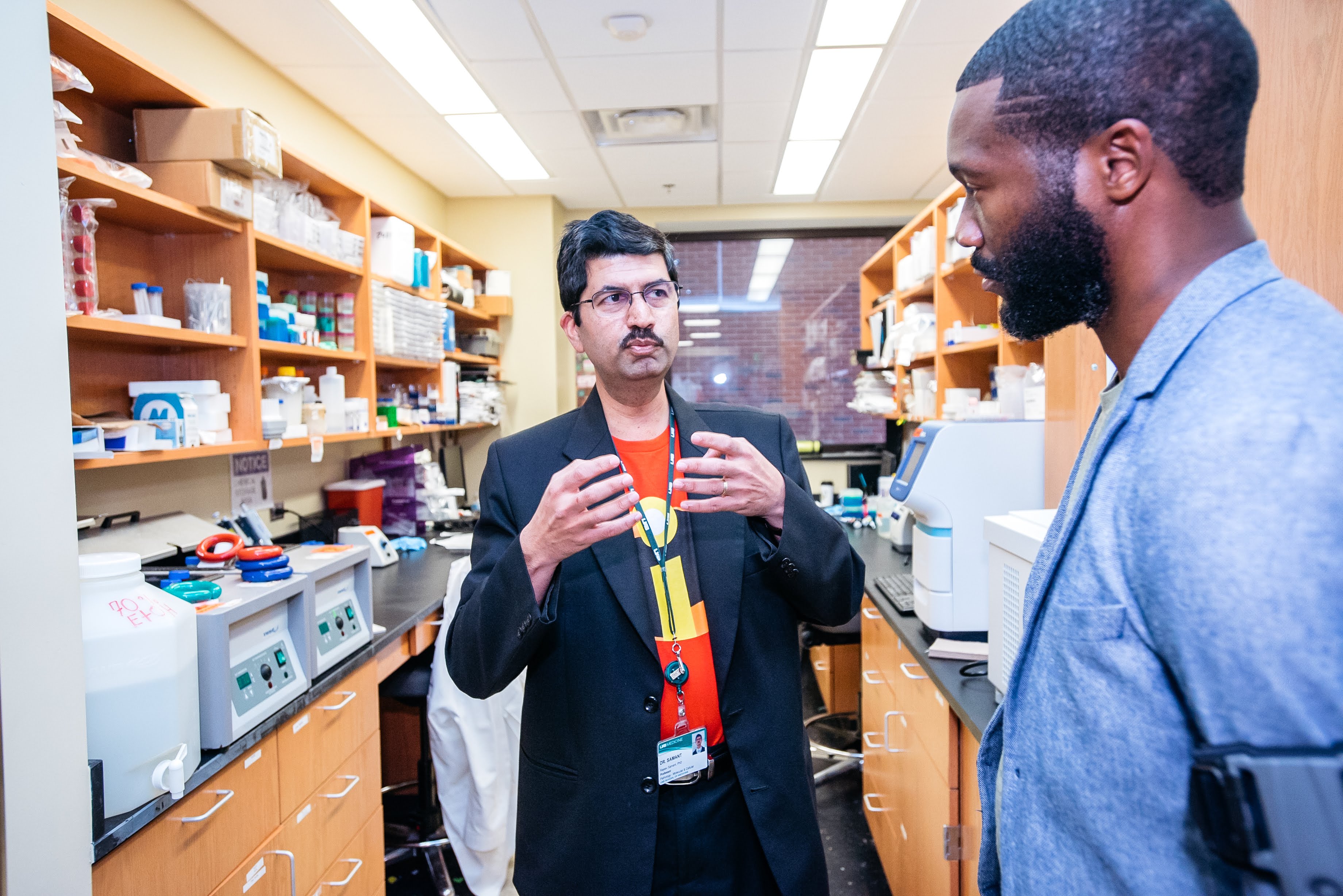 Rajeev Samant, Ph.D., Professor, received funding through May 2020 from the Veterans Administration for "IPA - Impact of N-Myc Interactor on Metastatic Progression of Breast Cancer." Samant played host to Birmingham Mayor Randall Woodfin during a Halloween-day visit to the UAB Comprehensive Cancer Center. Mayor Woodfin was scheduled to visit the laboratories of Drs. Lalita Shevde-Samant and Rajeev Samant. October is breast cancer awareness month and the Mayor and guests accompanying him were interested in learning about and getting an in action-view of the two laboratories. The graduate students, the staff and the PIs kept up their tradition of dressing-up for Halloween and gave a warm welcome to the Mayor. Dr. Rajeev Samant gave the mayor a quick overview of the cutting-edge breast cancer research performed at UAB. The students got the privilege of interacting with the Mayor and were impressed with his interest in the work.