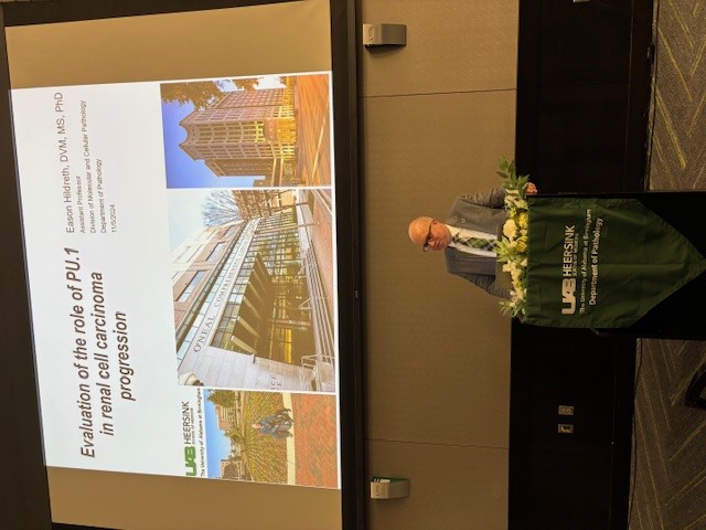 Eason Hildreth, D.V.M., Ph.D., Assistant Professor, Molecular and Cellular Pathology, delivered the afternoon talk, "Evaluation of the role of PU.1 in renal cell carcinoma progression" followed by the talk by Jianhua Zhang, Ph.D., Professor, Molecular and Cellular Pathology, titled, "Mitochondria in Alzheimer's disease." The highest scoring abstracts by trainees in predoctoral, postdoctoral, research and resident/fellow categories delivered oral presentations. These include Ezgi Sari, Anupam Raina, Ph.D., Asha Kumar, Ph.D., and Amy Theriault, D.O.