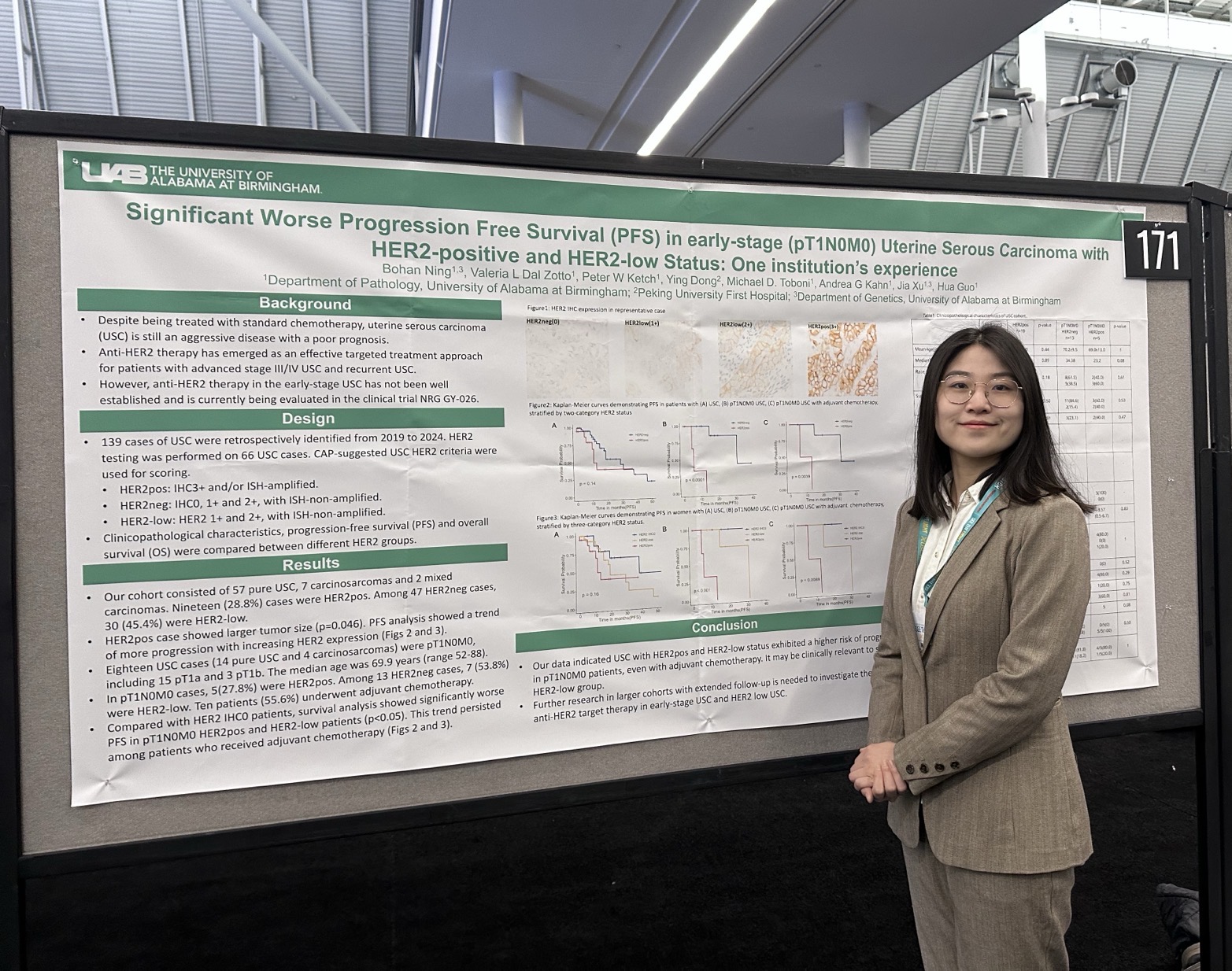 On Wednesday, March 26, Bohan Ning, M.D., Valeria L. Dal Zotto, M.D., Andrea G. Kahn, M.D., Jia Xu, Ph.D., and Dr. Hua Guo, presented the poster, “Significant Worse Progression Free Survival (PFS) in early-stage (pT1N0M0) Uterine Serous Carcinoma with HER2-positive and HER2-low Status: One institution’s experience.”