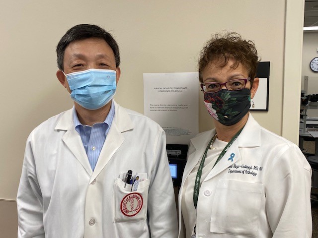 Dr. Wei with Dr. Cristina Magi-Galluzzi, AP Division DirectorHe is editor-in-chief of Human Pathology: Case Reports, and on the editorial board of Archives of Pathology and Laboratory Medicine, Journal of Clinical and Translational Pathology, and chief editor, Breast Pathology Section, Digital Anatomic Pathology Academy. In addition, Wei serves as ad hoc reviewer for dozens of medical journals. He has published around 160 peer-reviewed manuscripts, 140 of which were during his time at UAB.