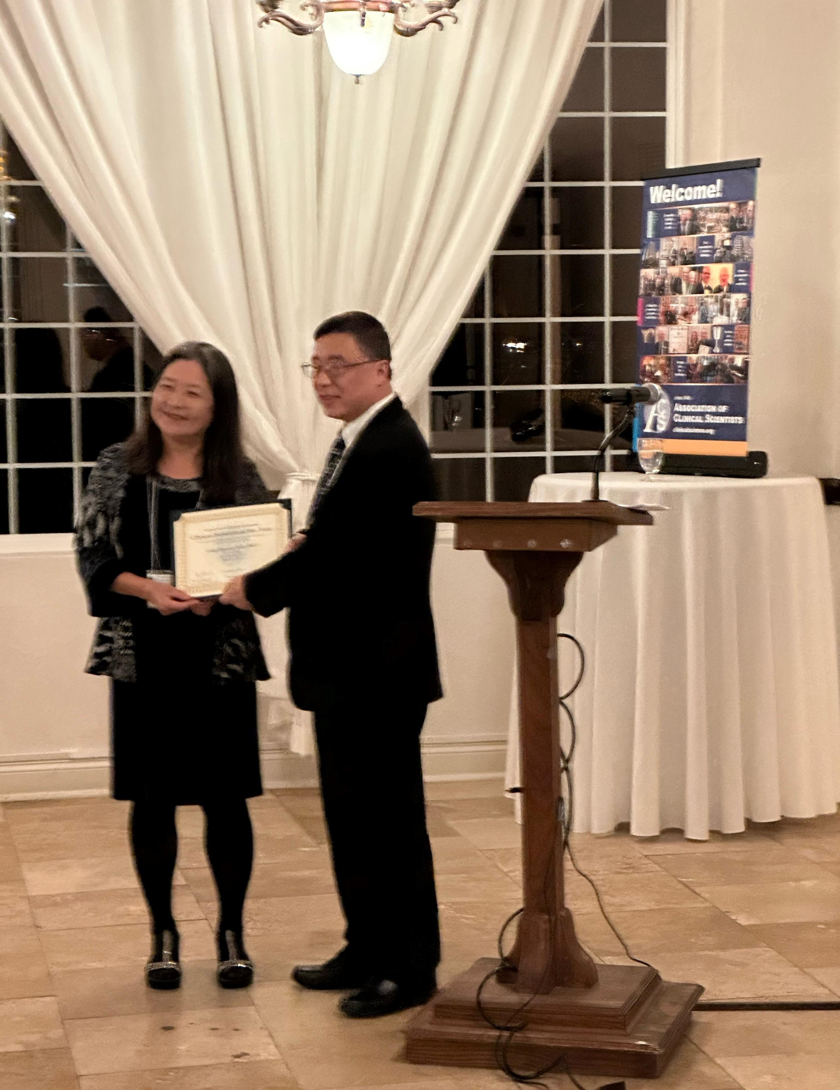 Dr. Shuko Harada, left, receives the Clinical Scientist of the Year award from outgoing ACS president Dr. Yusheng Zhu