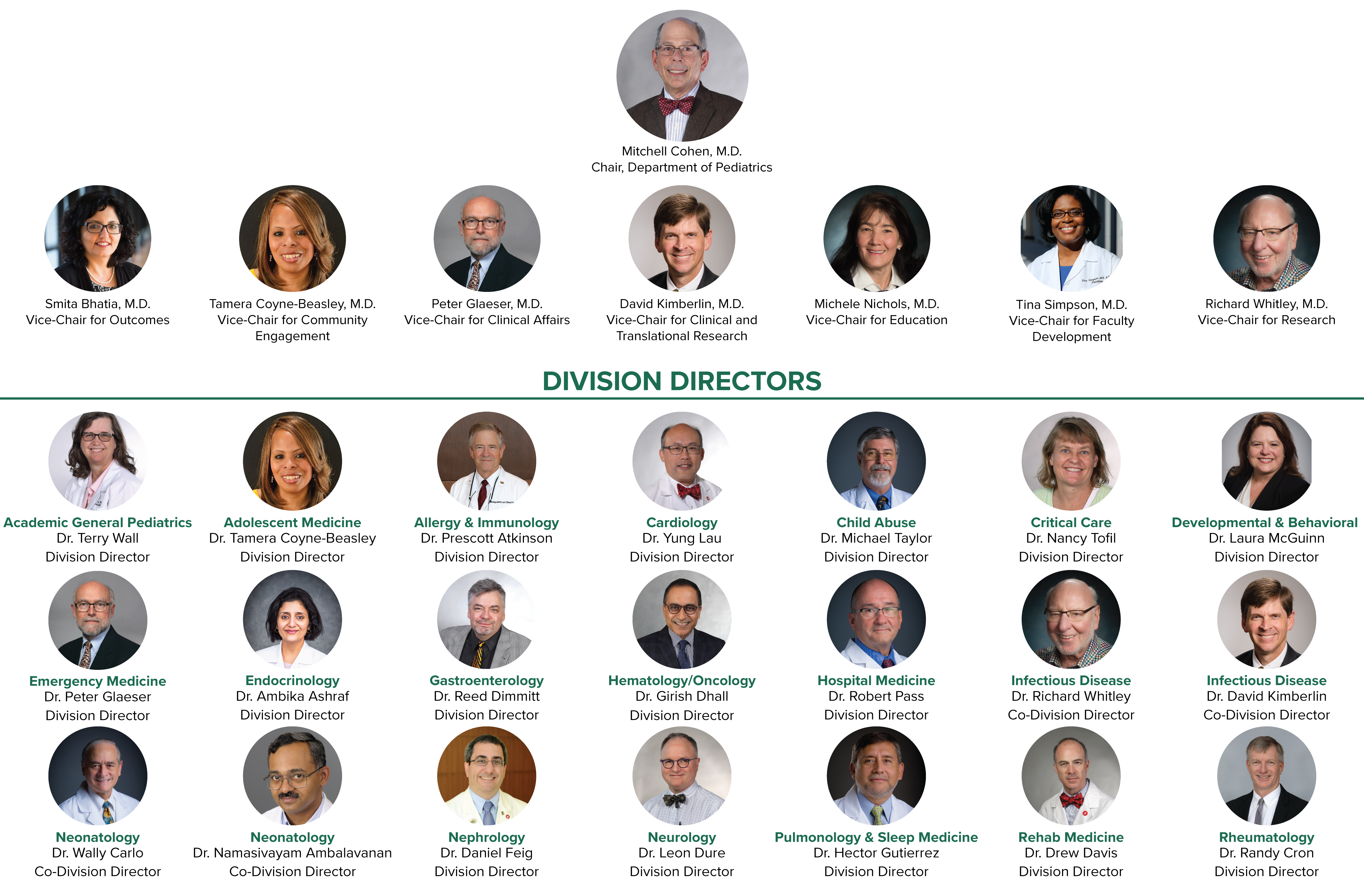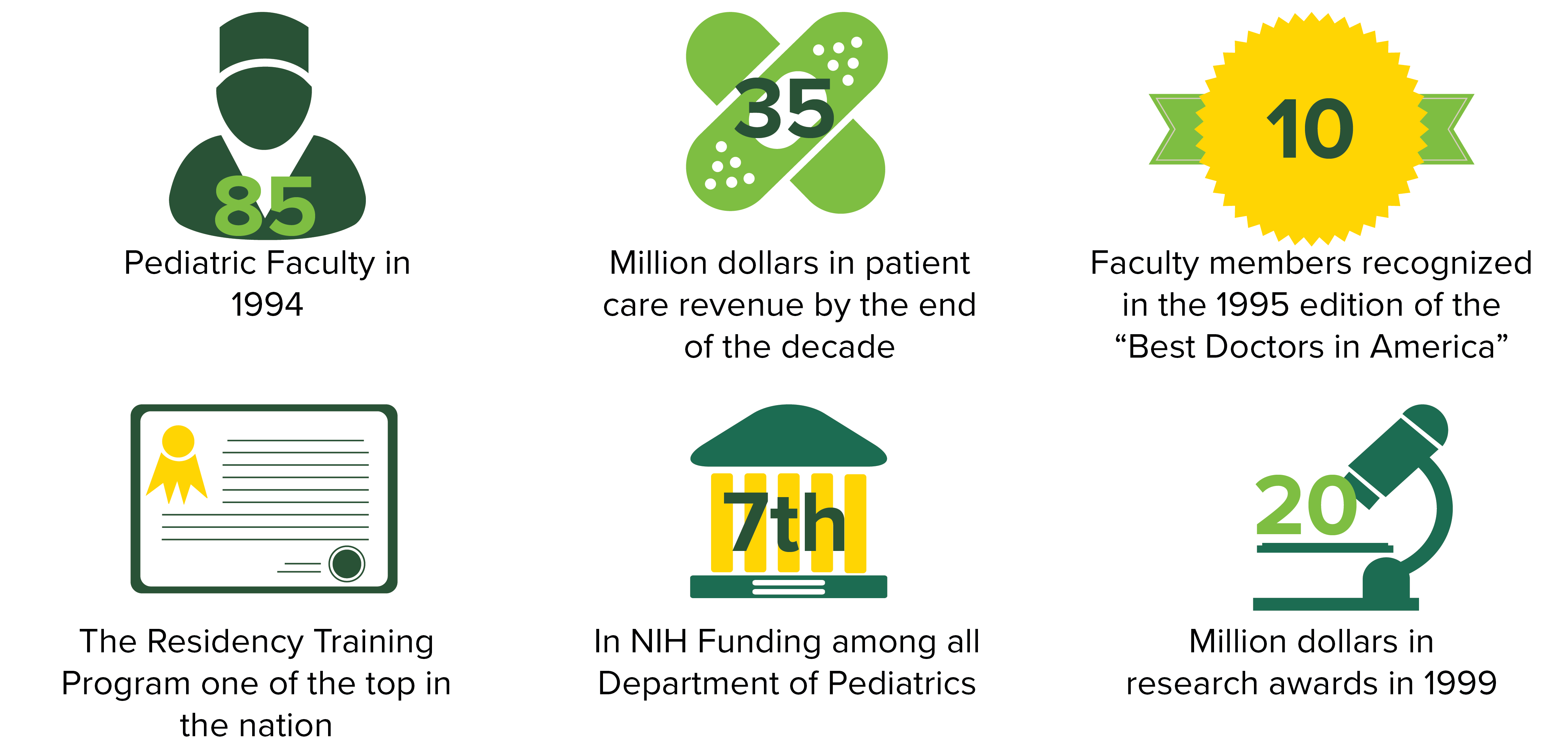 Dean Vickers was very successful in negotiating with UAB’s President Watts, CEO of Health System, Will Ferniany, and CEO of Children’s of Alabama, Mike Warren, to secure a significant recruiting package that provided strong support for Dr. Cohen’s vision for the future of the department. The priorities were the expansion of the faculty across clinical divisions in order to provide timely access for subspecialty appointments, renewed efforts to increase NIH funding and the pursuit of academic excellence, strengthen the relationships with the community of private pediatricians across the state, and, finally, advocate for pediatricians at all levels from state government to national organizations (AAP, SPR, APS, AMSPDC) and major insurance companies.