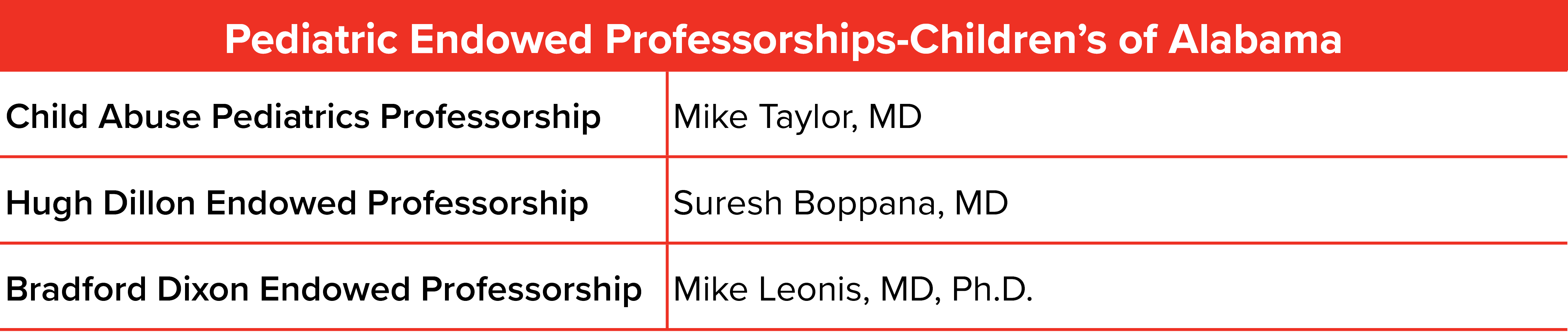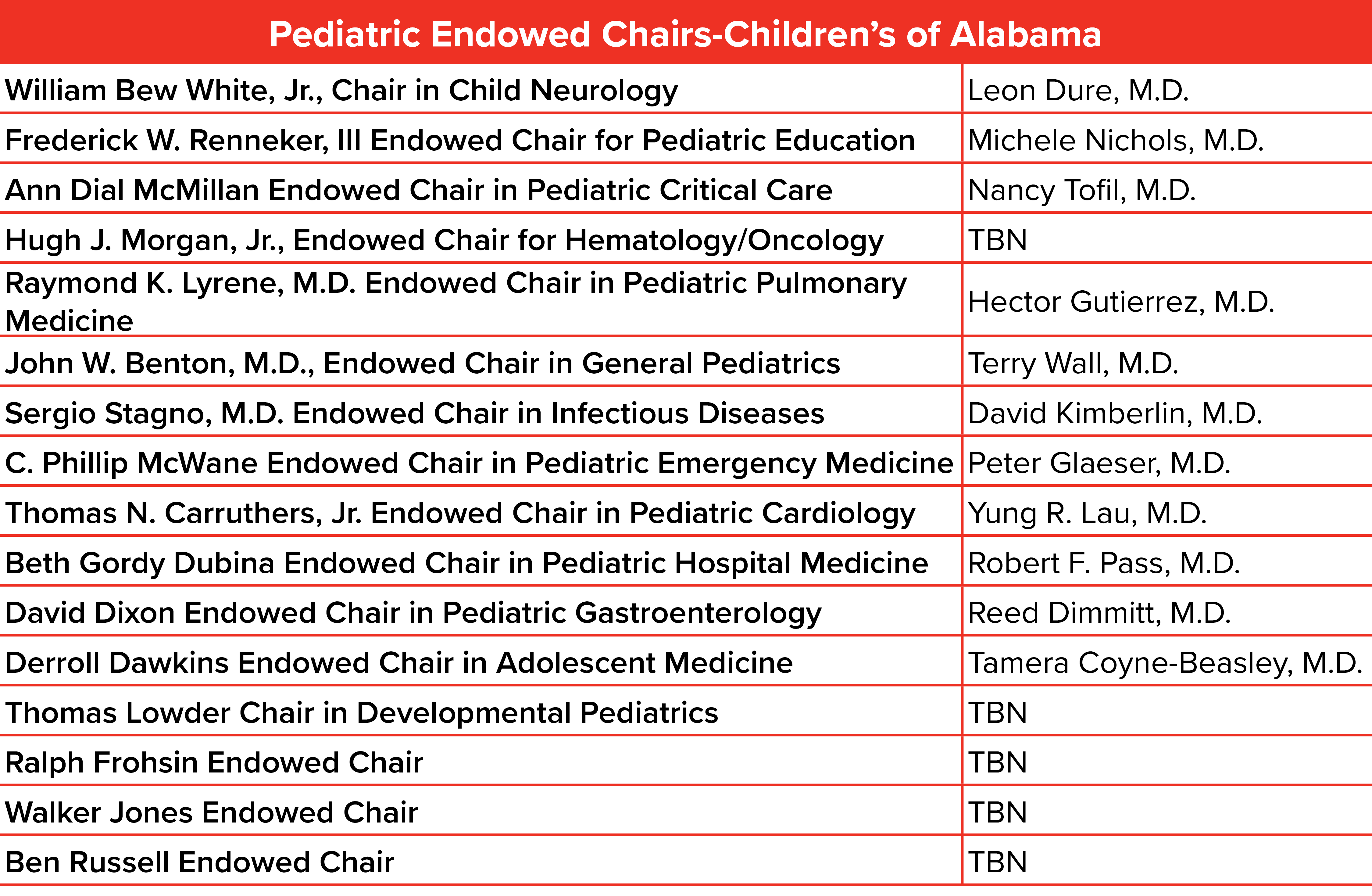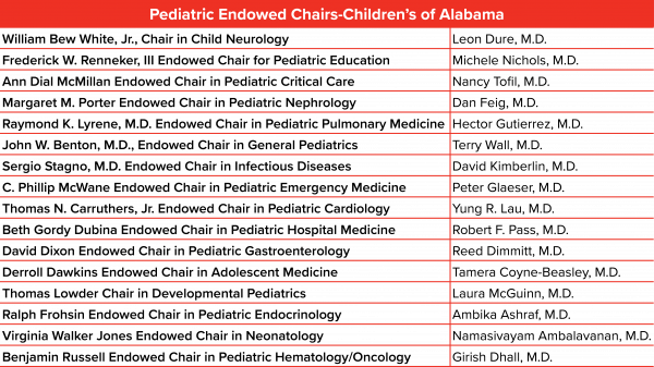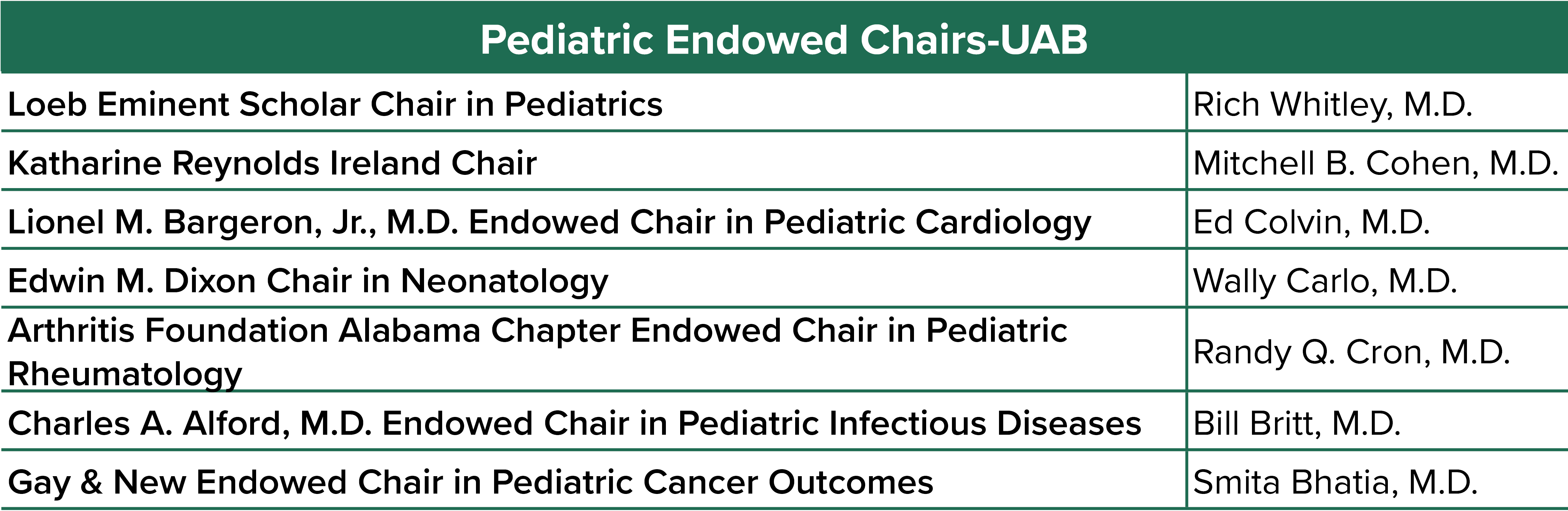 As of 2018, the number of endowed chairs has increased to 23 with seven chairs residing at UAB and 16 residing at Children’s Hospital. The goal of establishing at least one significant endowment for each division is close to reality.