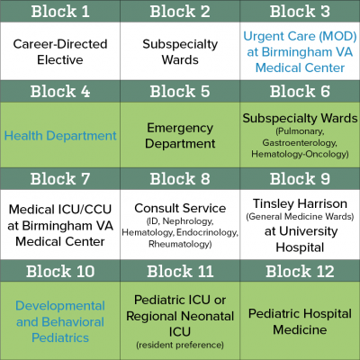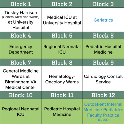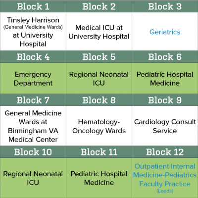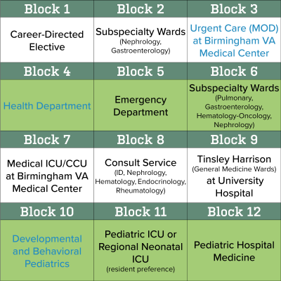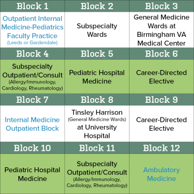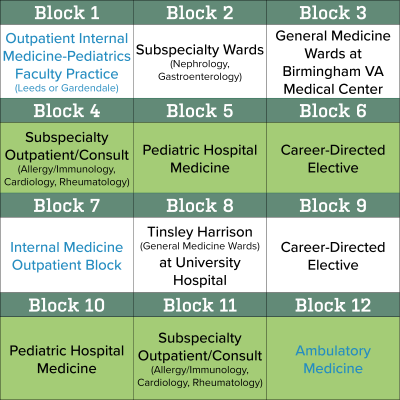 Our Med-Peds training program hosts weekly noon conferences every Wednesday attended by our Med-Peds core clinical faculty, residents, and UAB School of Medicine Med-Peds Interest Group members. Speakers are invited to discuss topics pertinent to internal medicine and pediatrics and cover a range of medical topics as well as topics related to transition, wellness, quality and safety, professional and personal development. We also have quarterly town halls and twice a year PGY class check-ins which provide residents the opportunity to discuss improvements to the program.